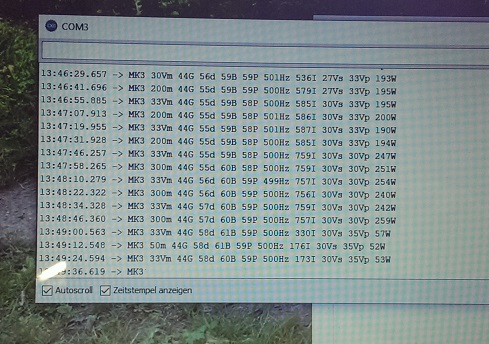 In der Letzten Zeile habe ich die Leistung auf 50W begrenzt. Und siehe da, am Panel liegen 35V und nicht der MPP Sollwert von 30V.