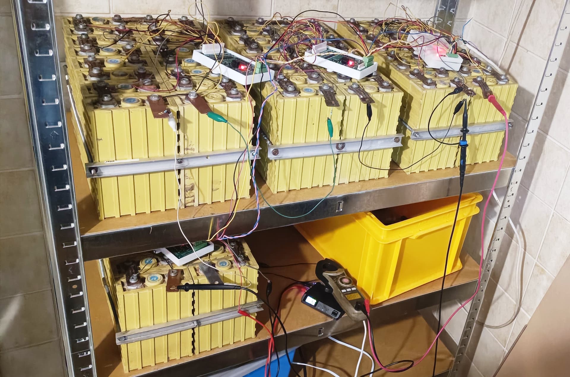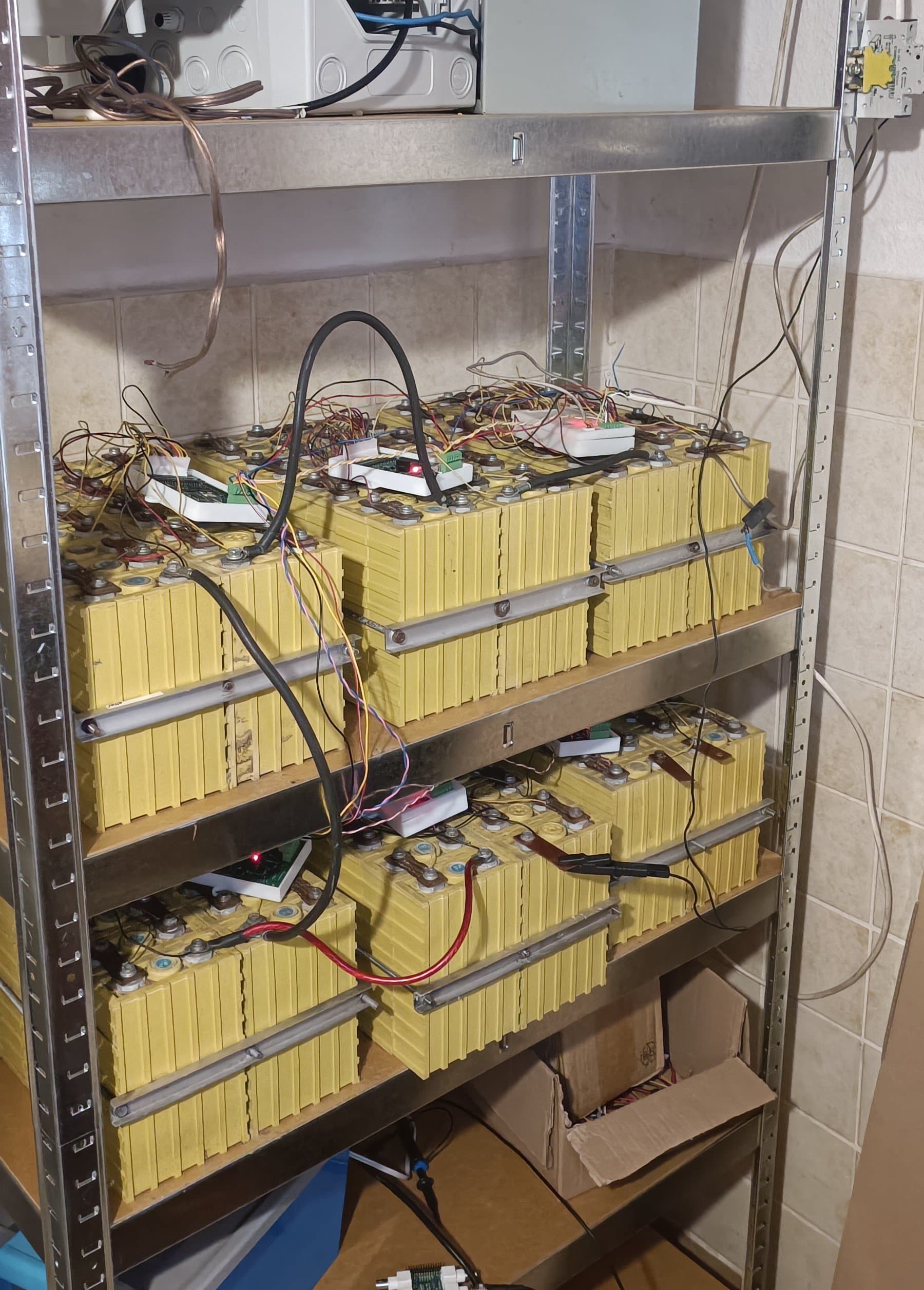 Ich habe jetzt mal 64 von meinem 160 arg ausgelutschten LFP Zellen an den Hybrid-Wechselrichter angeschlossen (ja ich weiß, dass da Netzpotential drauf ist). Die soll dann meine jetzige stationäre 48V Batterie ersetzen
