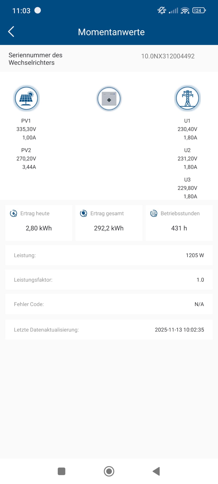 Hier mal ein Bild vom 13.11.2025 um 11:03 Uhr. War ein sonniger Vormittag und trotzdem wenig Leistung.
