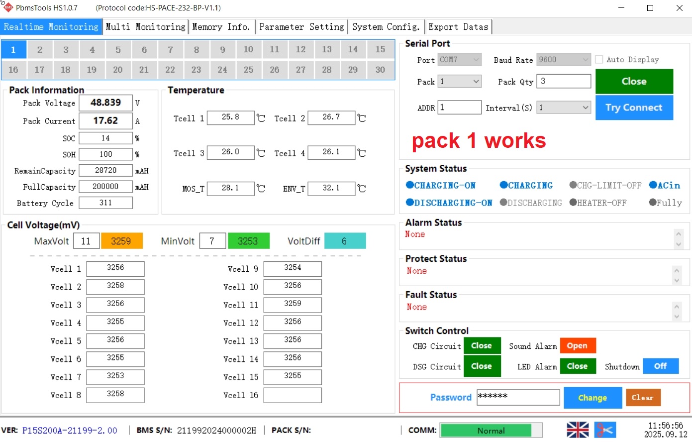 Dein Pack 2 hat 48,1 V, Pack 1 aber 48,8 V. Somit scheint es eine Unterbrechung irgendwo zu geben, sei es auf dem BMS oder in der Verkabelung. Normalerweise sollten die Spannungen ja gleich sein.