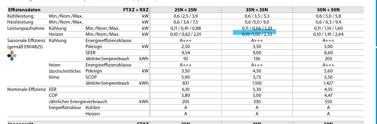 Ich glaub, da hast du irgendwie falsche Daten. In deinem Datenblatt der Ururu steht doch 0,1kW als minimale Leistungsaufnahme beim Heizen. Also 100W. Die Panasonic wird da ähnlich liegen. Alle Geräte der A+++ Klasse und 2,5-3,5 kW modulieren irgendwo im Bereich 90-180 Watt runter.