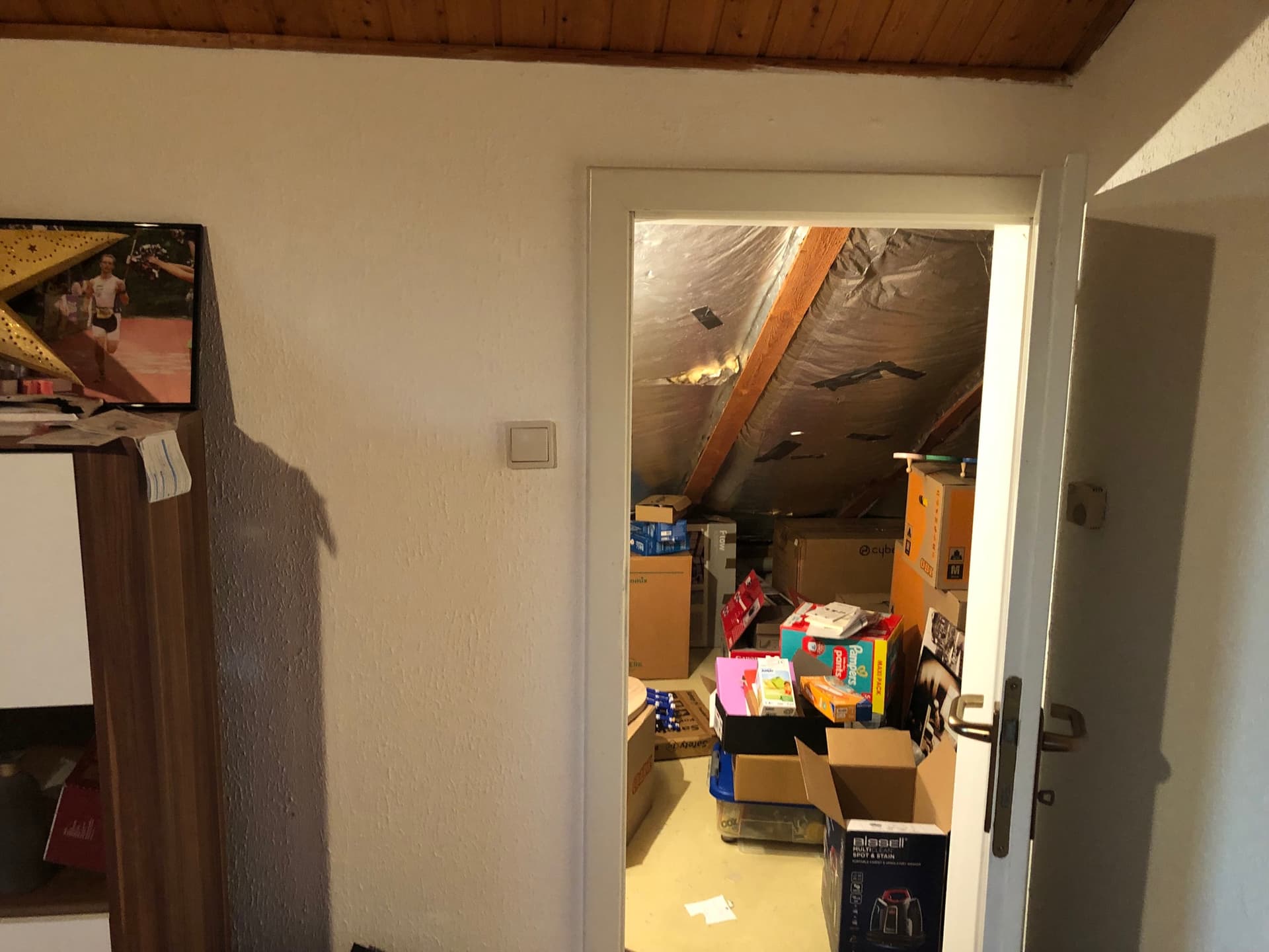 die Dämmung des Daches ist als Zwischensparren Dämmung auf dem letzten Bild erkennbar. Gibt es noch eine zusätzlichen "Aufsparren Dämmung"? Wenn das 14 oder 15 cm Sparren sind, dann ist die Dämmung nicht so gut, wie angenommen. Der Blick in die Abseite zeigt, dass die Dampfsperre nicht mehr perfekt ist. Wenn mal Zeit ist, sollte das nachgebessert und vielleicht mit einfacher Verkleidung geschützt werden.