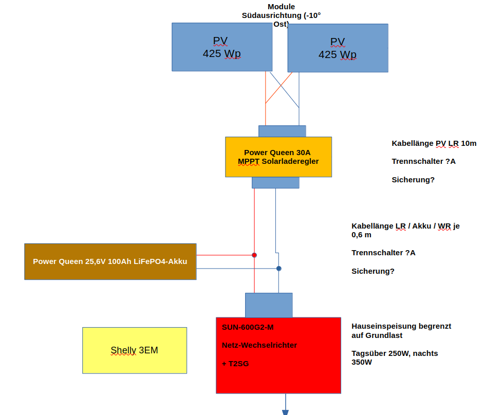 Gefrickelt werden muss dann bei Überschuss das Einspeisen zu verhindern. Selbst daran zu scheitern ist unkritisch, 80% der Aufgabe erfüllt sich ohne eigene Aktivität, sofort mit Einschalten des BKW.