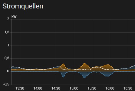 Mein Thema ist, dass die Einspeisung nicht immer gleichmäßig ist. Diese kann schwanken. So kann es sein, dass ich mal 10 min in der Einspeisung bin, dann 30 min wieder nicht, dann wieder Einspeisung. An anderen Tagen können auch mal 2h komplett Einspeisung sein. Je nach Sonne, Last, etc. Siehe Beispielbild.