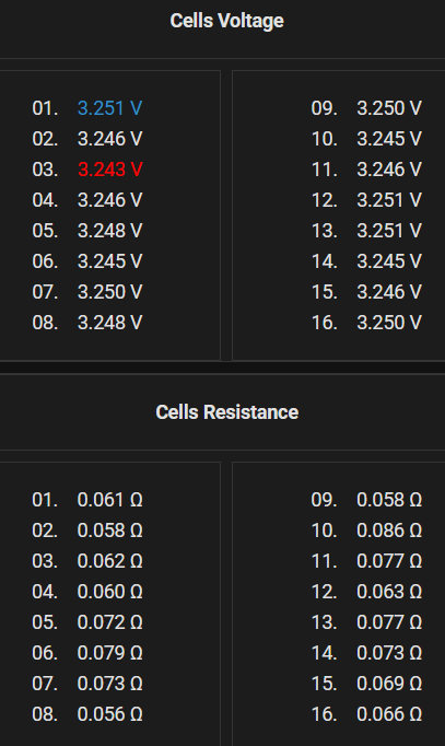 Was mir aufgefallen ist, 03 (3.287V) und 04 (3.286V) haben mit etwas Abstand die höchsten Volt Werte. Aber vielleicht sind sie einfach nicht balanciert worden.