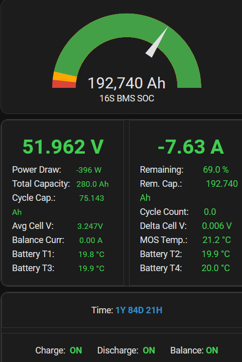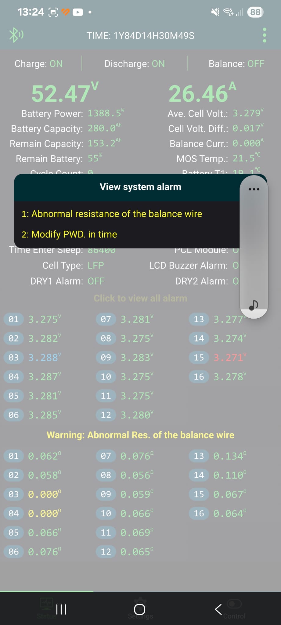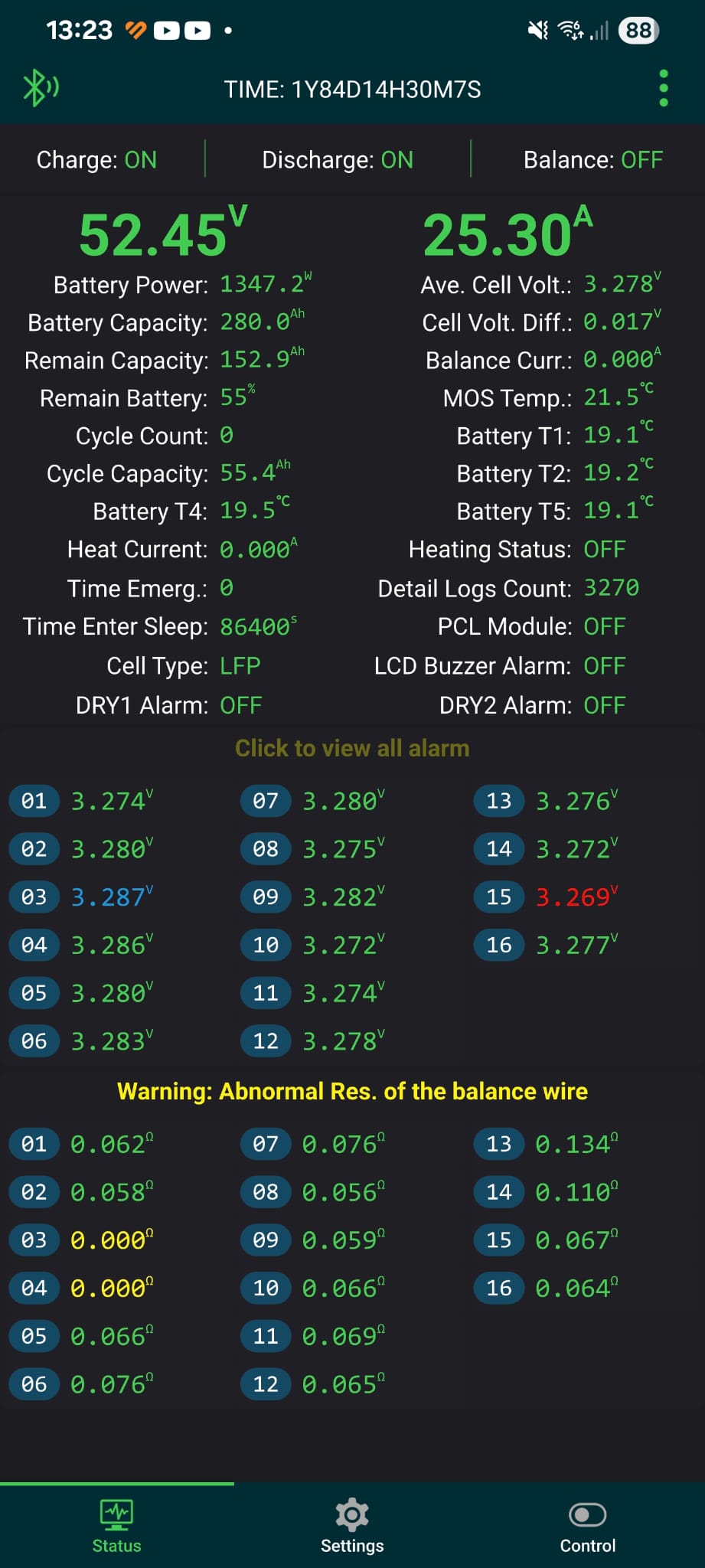 Grund war der SOC der irgendwie gar nicht korrekt angezeigt wurde. Bei 48V 45% kann mMn. nicht korrekt sein. Auch der Balancer zeigte mir um die 0,02A an. Der Unterschied war aber schon 0,08V und eingestellt 0,01V ab 3V. Im Moment haben die Zellen zwischen 3,12 und 3,2V. Balance Curr: 0.00A (was evtl. an den 2 falsch erkannten Zellen liegen kann)