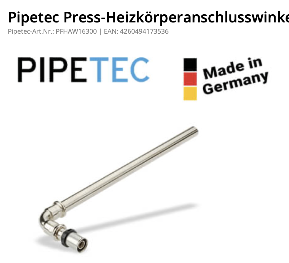 Produktbeschreibung lautet: * Pipetec Press-Heizkörperanschlusswinkel vernickelt 16 x 2 - 15 mm - 300 mm also das Rphrstück hat dann wohl 15mm Durchmesser.