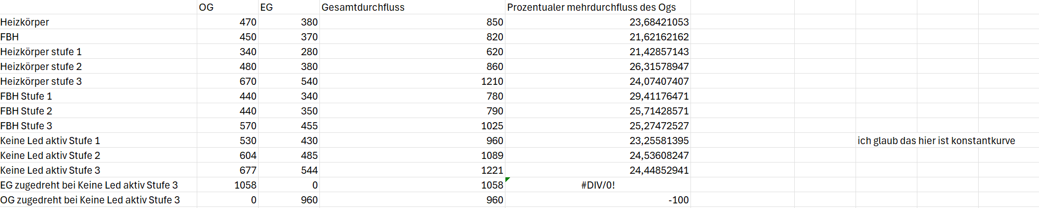 So jetzt hab ich gestern mir ne tabelle gemacht um die Durchflüsse im System zu testen. Ich verlink sie hier auch mal - aber wenn ich mit der vorhandenen pumpe nur auf ein Stockwerk fahre (anderes zu) komm ich auf knapp 1m³. Dadurch denke ich das der Durchfluss in meinem system gegeben ist (abtauenergie etc..). Ich hatte auch jedes Stockwerk einzeln mit 28mm angebunden bis in den keller.