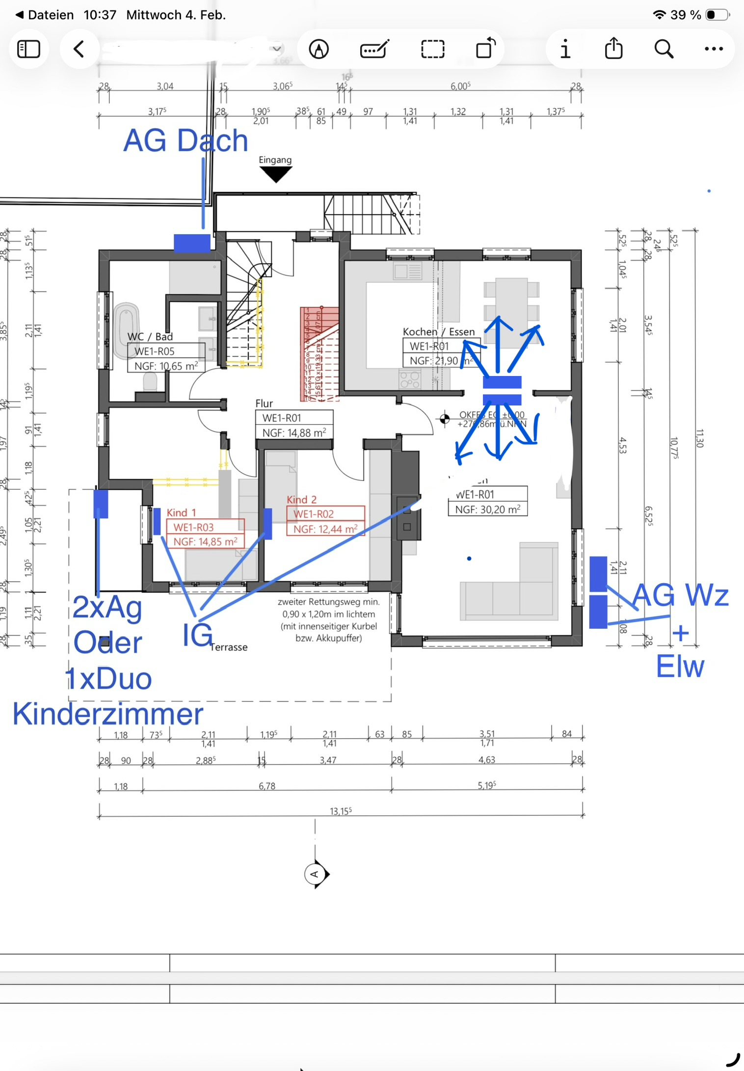 @redhot hier hab ich noch mal die Positionen angepasst. Im Wohn-Essbereich kann es gut möglich sein, die Innengeräte an den Sturz der Wanddurchführung zu hängen, da habe ich zwischen Decke und Unterkante etwa 35cm. Laut Montageanleitung von Daikin braucht das IG 30mm Luft nach oben und ist 298mm hoch, das sollte also eigentlich passen, wenn auch knapp. Was meinst du da zu der Luftführung?