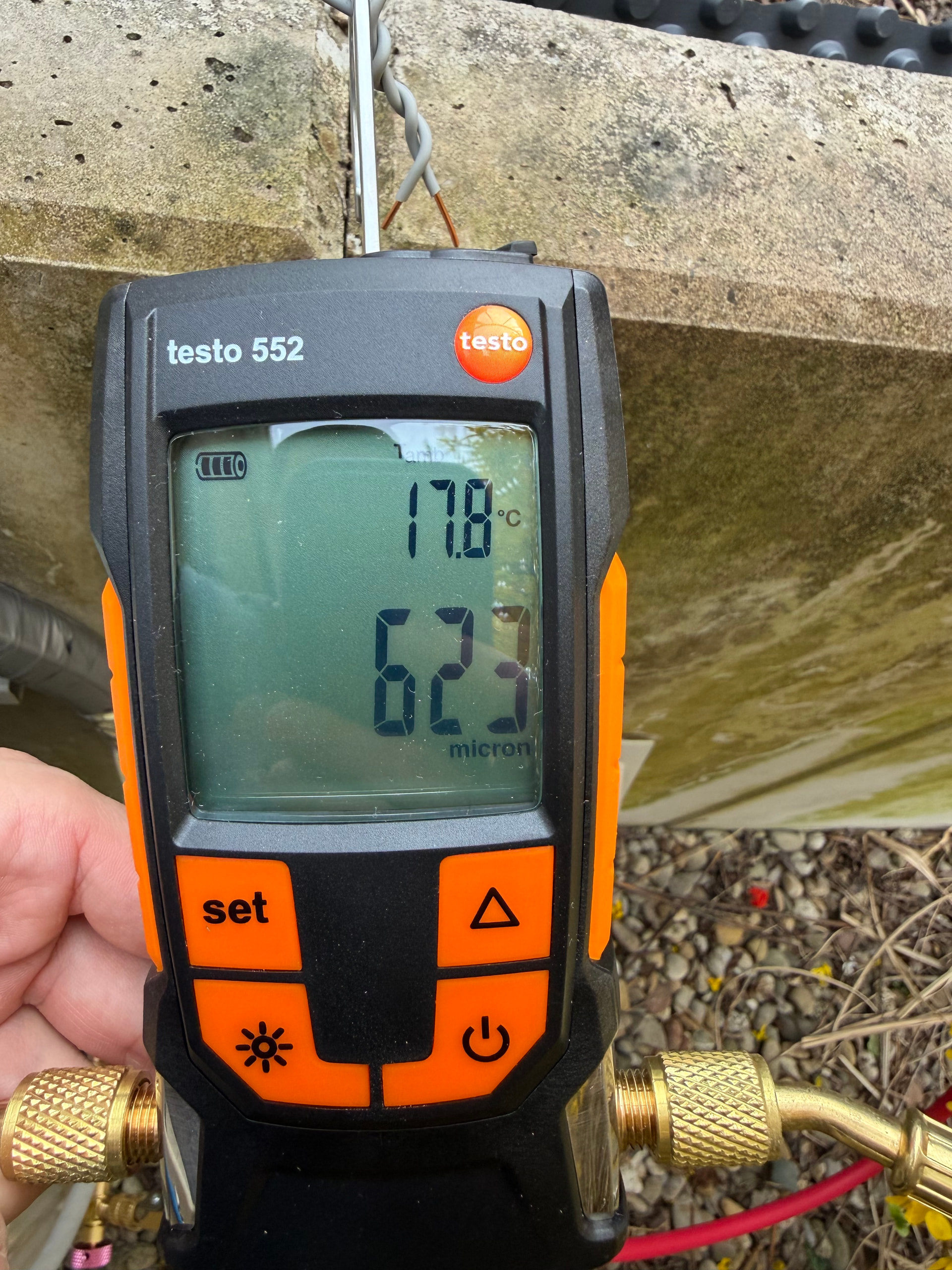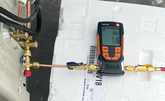 Ein Testaufbau war nun Vakuumpumpe → Gelber schlauch → Monteurhilfe → Blauer Schlauch → Testo 552 oder Elitech VGW Mini.