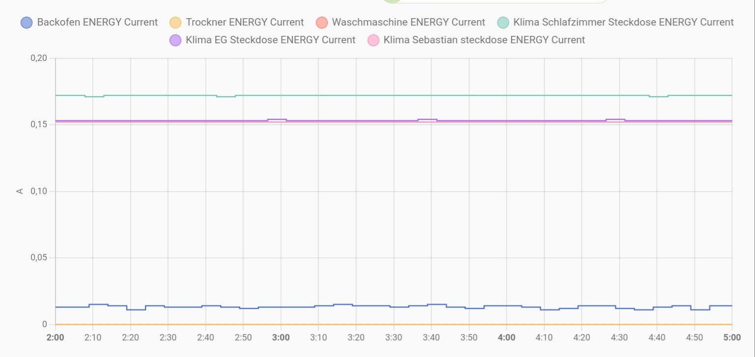 Ich habe gerade grafik leisungund strom angesehen. Bei leistung wird nachts durchgängig 4 W angezeigt, bei strom 0,15 A , was 35 W (rechnerisch) wäre. Ist vielleicht doch so ne blindleistung sache. Auf jeden fall passen leistung und strom schon mal nicht zusammen.