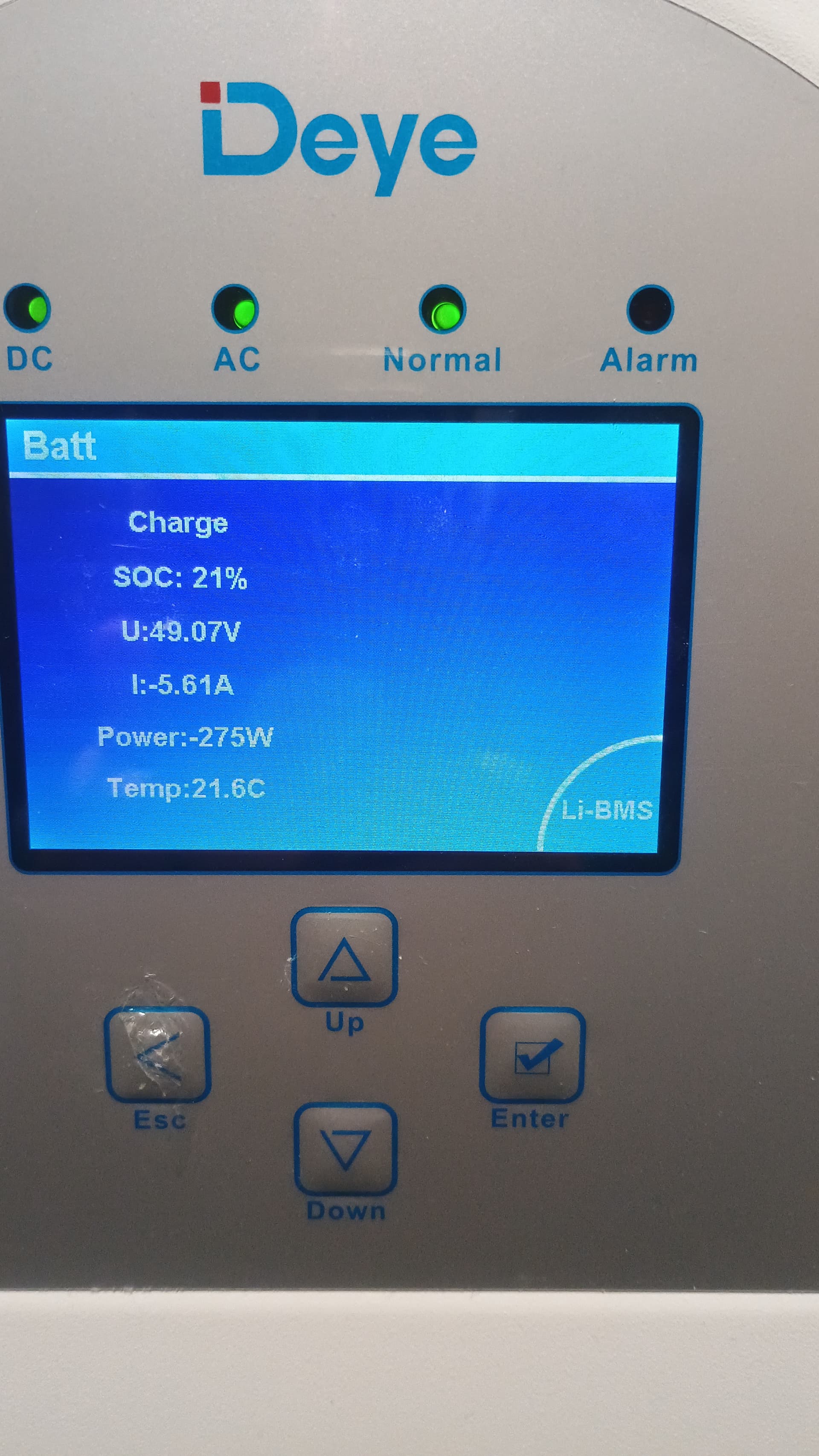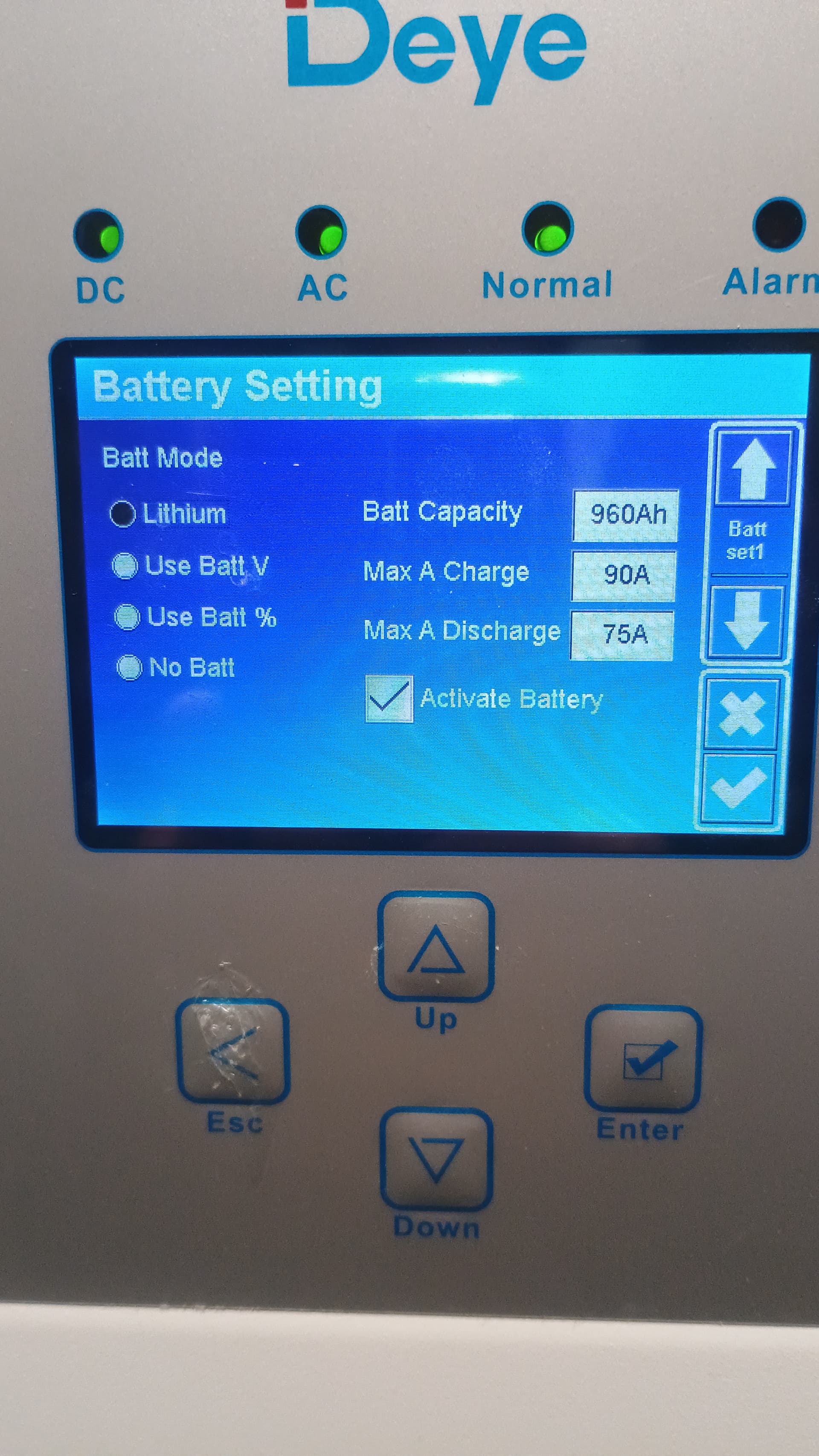 Nachdem der Deye 12K eine Verbindung über CAN mit dem BMS von Pylontech hergestellt hatte, wurden sämtliche Werte automatisch vom Wechselrichter übernommen. Ich habe keine Möglichkeit gefunden, diese manuell zu ändern. Alternativ könnte man über die Spannung (Voltage) arbeiten, aber laut Hersteller ist die Kommunikation über das BMS der sicherste und zuverlässigste Weg für das Batteriemanagement.