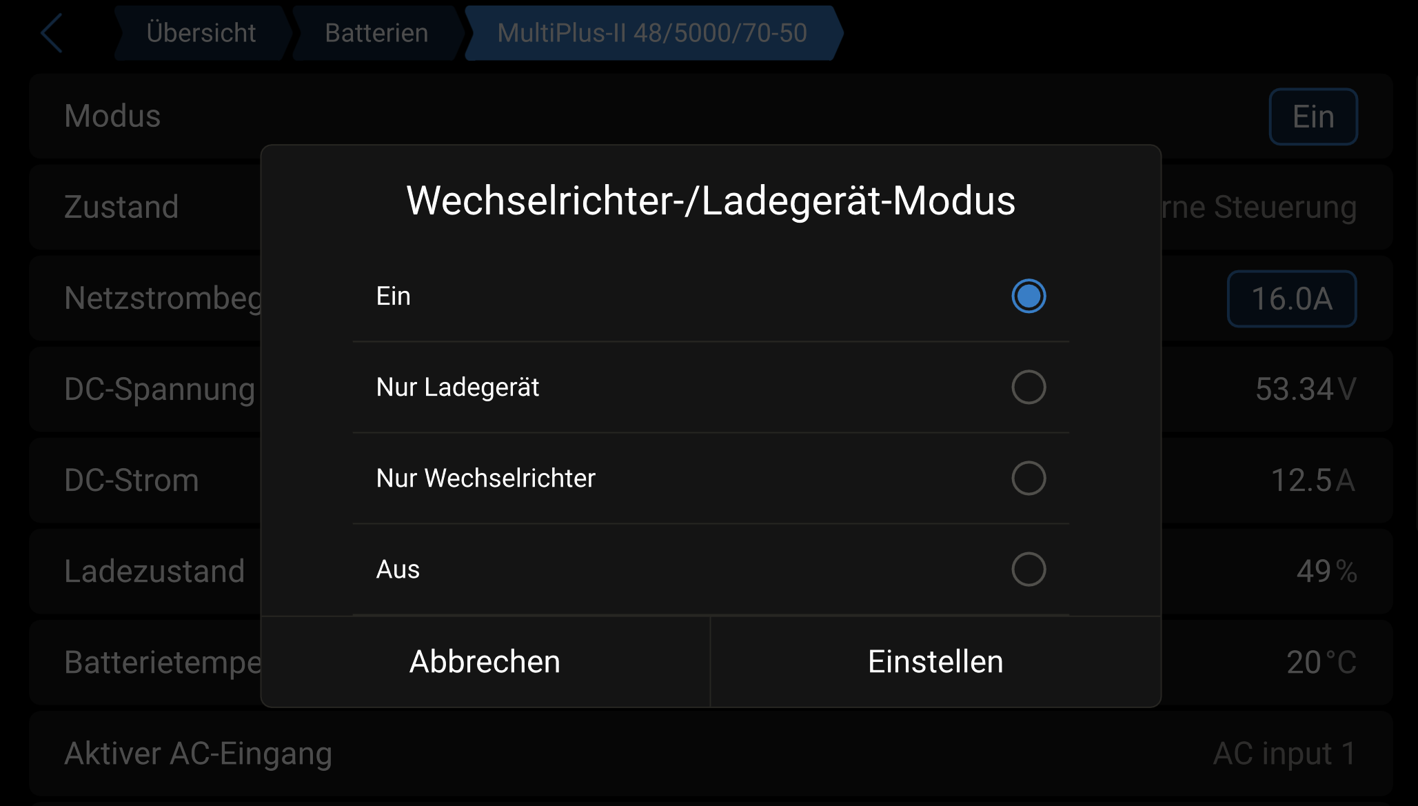 Die Zustände lassen sich auch über die Victron Remote Console händisch schalten, aber nicht ohne Weiteres automatisiert.