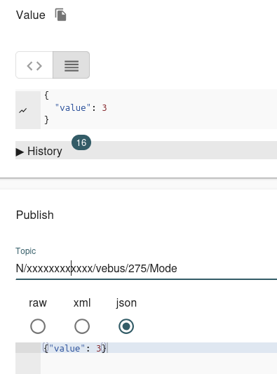 Geschaltet wird das über das MQTT Topic N/xxxxxxxxxxxx/vebus/275/Mode, welches einen Zustand 1 bis 4 bekommt. mode: 1=Charger Only, 2=Inverter Only, 3=On, 4=Off. Wird vom HAOS mit {“value”:3} für z.B. "Ein" ans Venus im Multi übergeben. Entweder im json oder raw Format.