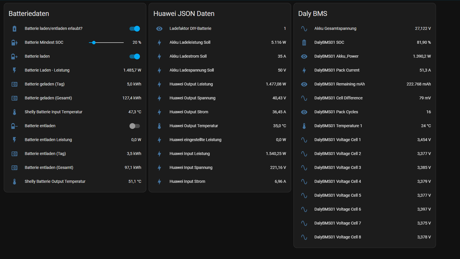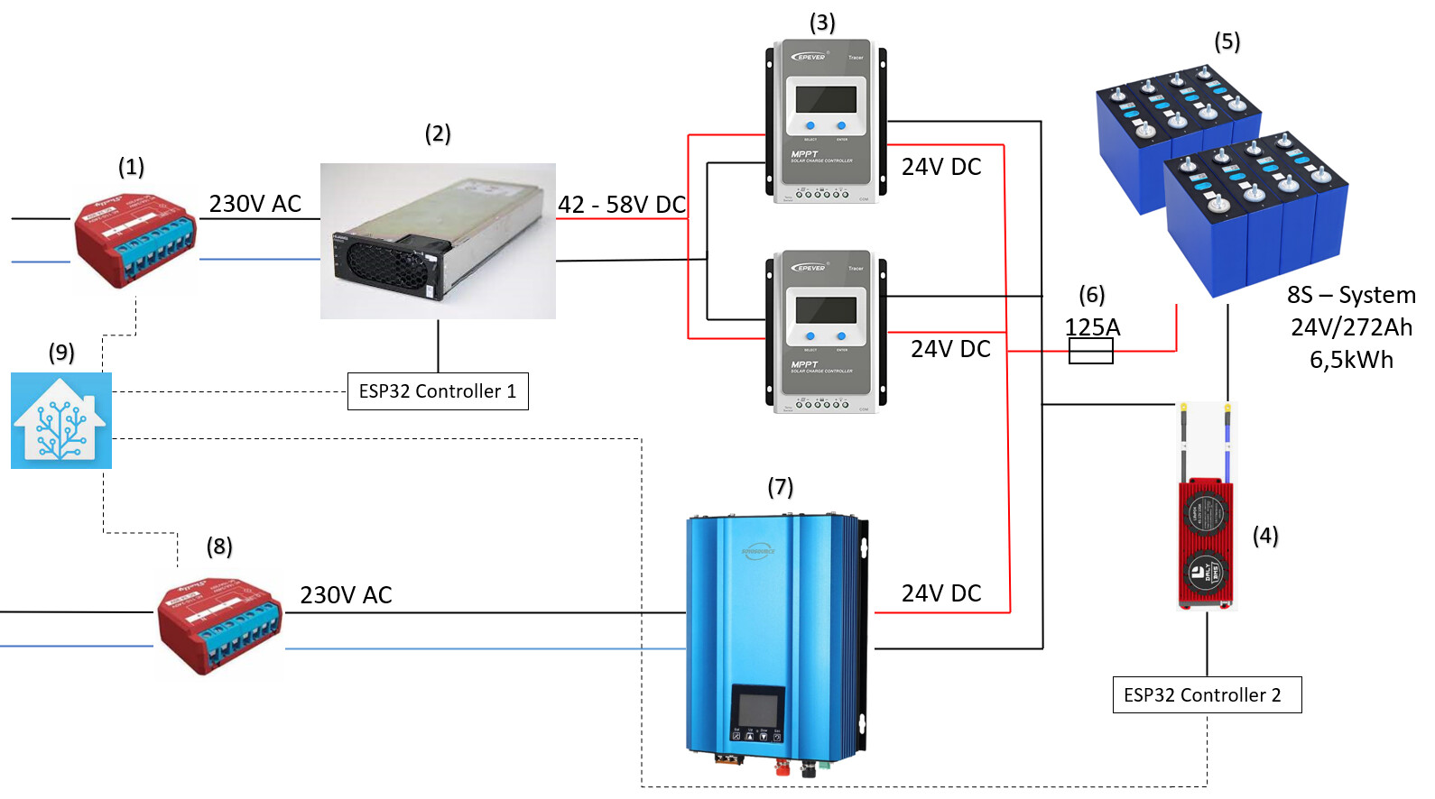 (9) Home Assistant Server - die beiden ESP Controller sowie die Shellys (1) und (8) werden in Home Assistant (Shellys via HA-Erweiterung, ESP Controller via MQTT) integriert. Home Assistant wird bei mir als Smart Home Zentrale genutzt und steuert aktuell bereits viele AC-Lasten (je nach PV Überschuss: Wallbox 1, Wallbox 2, Heizstab) sehr zuverlässig.