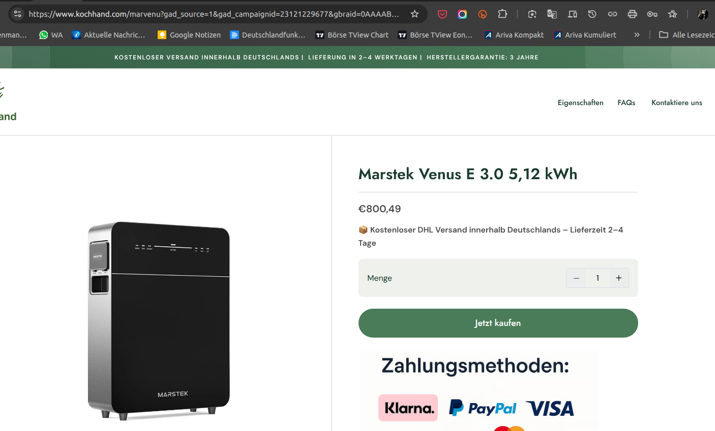 Nun ja , der Marstek ( Venus E mit 5,12 kwh ) ist jedenfalls günstiger wenn man die rel. Kosten pro KWh vergleicht …außerdem funktioniert beim Marstek das Überschussladen ganz gut und er kann 2500Watt einspeisen …beim Anker-AC-Speicher funktioniert lt AnkerSupport Überschussladen gar nicht wenn man eine SB2Pro hat ….Nutzt man zusätzlich zur Balkon-PV ( Ich ernte derzeit im Dez. 25 Erträge bis 4,5 kwh / Tag …4x500Watt Module …im Sommer dürften bis zu 10 kwh / Tag möglich sein, bei einem durchschnittlichen Verbrauch von 3kwh/Tag ) auch noch dynamische Tarife kann sich so ein Speicher auch rel. schnell amortisieren …. Derzeit kostet der Marstek Venus E für sehr günstige 800 € ….Kochhand.com : Ich hoffe das ist kein FakeShop…Erfahrungen mit diesem Shop wären hilfreich … hab nichts dazu im Web gefunden…
