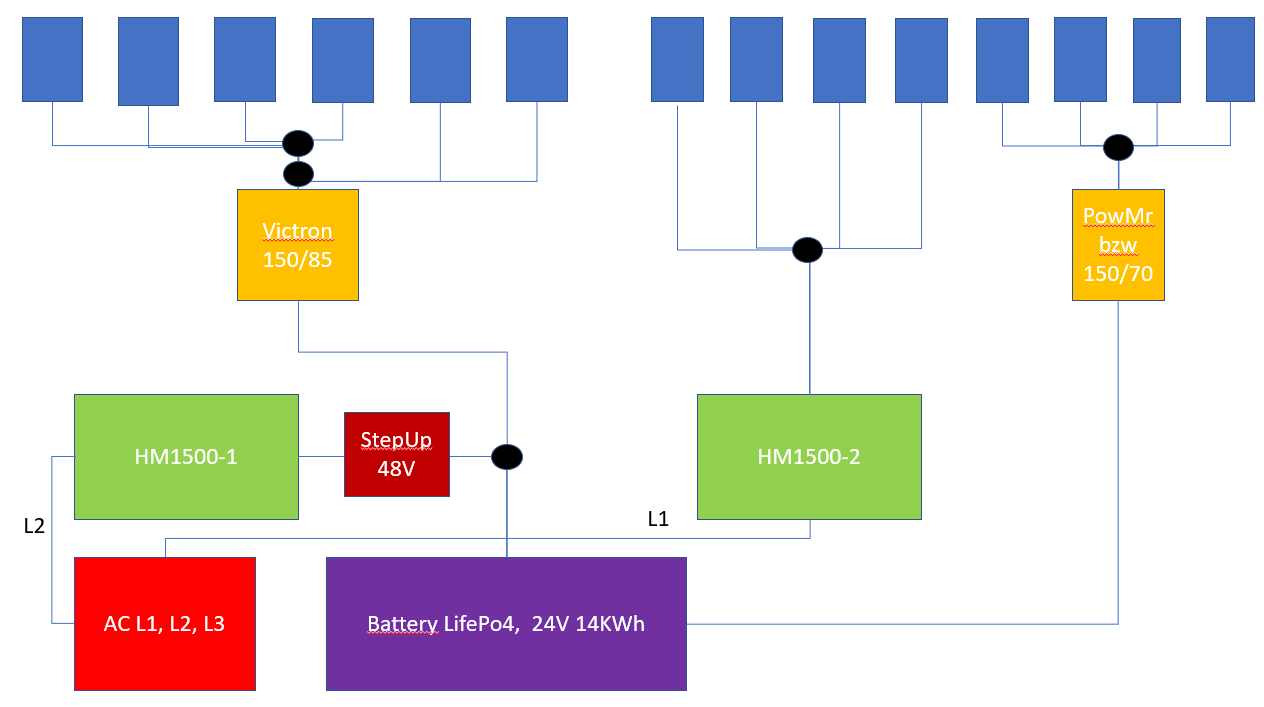 der Plan steht jetzt. Es ist wie häufig im Leben ein Kompromiss geworden. Einen der Beiden HM-1500 nutze ich als Modulwechselrichter und speise direkt AC seitig in die L3 Phase ein.
