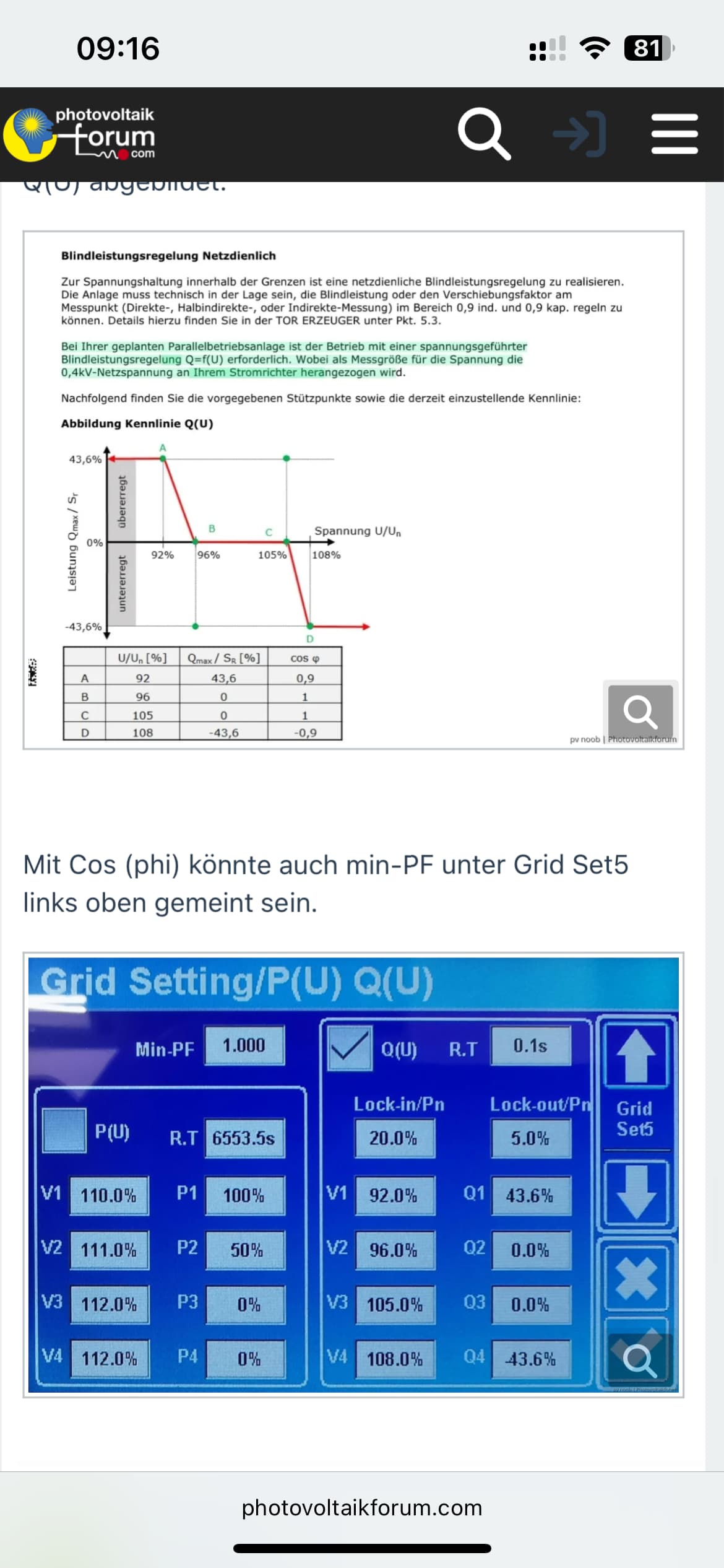 Ich bin mir nicht 100% sicher ob es beim Deye Sun 12k die Netzeinstellung V(Q) Blindleistung des WR vs. Netzspannung vgl. Mit Q(U) gemäß TAB, AR N 4105 ist?