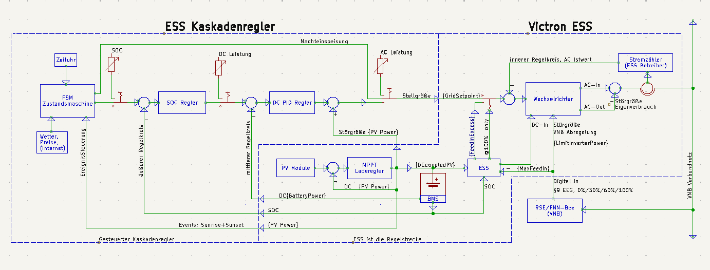 Insgesamt betreibe ich das ESS in einer Kaskadenregelung. Das ESS ist dabei die Regelstrecke. Die übergeordneten Kaskaden regeln dann eine konstante Akkuleistung oder wahlweise einen konstanten Accu SOC aus. Das funktioniert auch ganz gut, solange die Regelstrecke im schnellen Modus ist. Im langsamen Modus kann man das Verhalten vergessen. Der Akku Leistungsregler geht mehrfach in die Begrenzung bis nach ein paar Minuten dann echt geregelt werden kann.