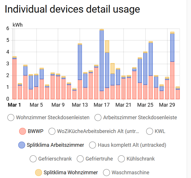 Strom: Für mich hab ich unten jetzt noch meine in bisheriger Form notierten + verrechneten Zahlen gelistet, plus was mit HA ausspuckt. Denke ich künftig nur noch die HA Zahlen, soweit da verfügbar. Mit Hochladen statt c&p bekomme ich jetzt auch die Grafik davon hier rein.