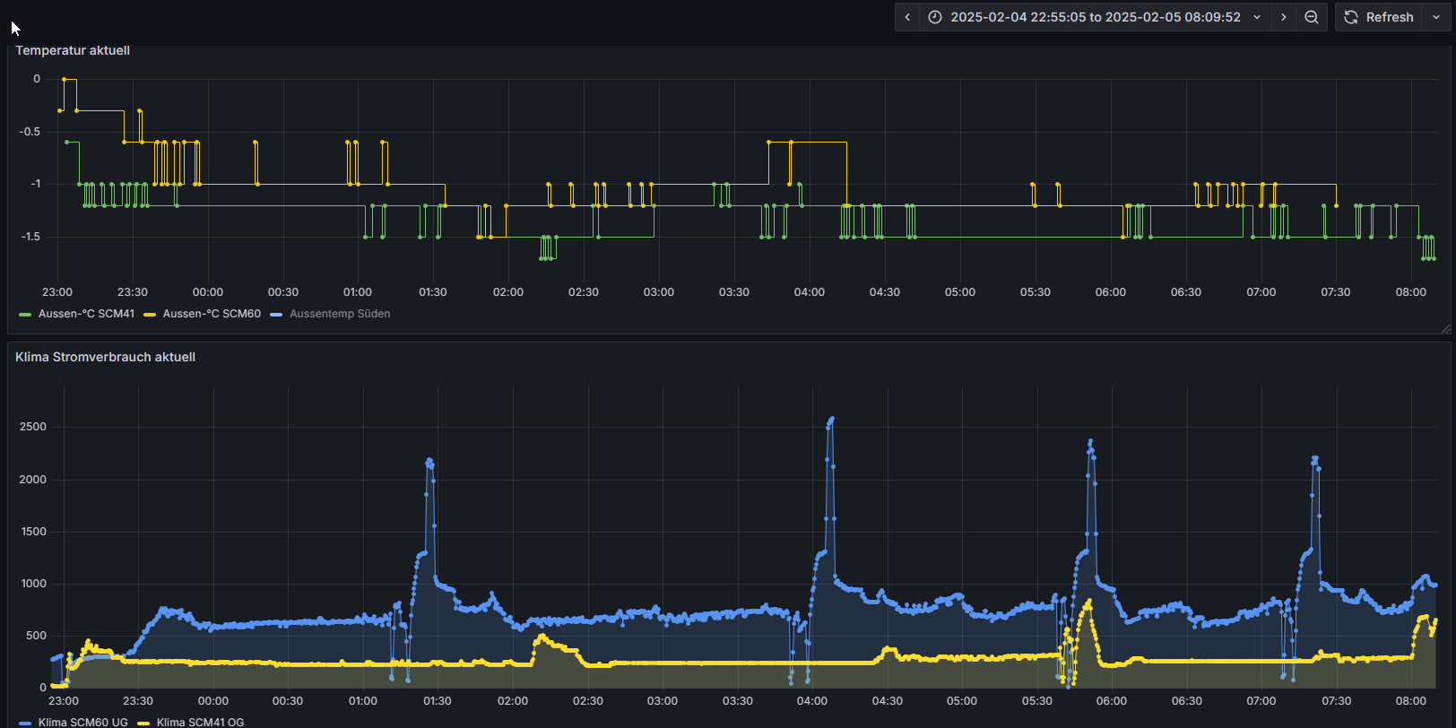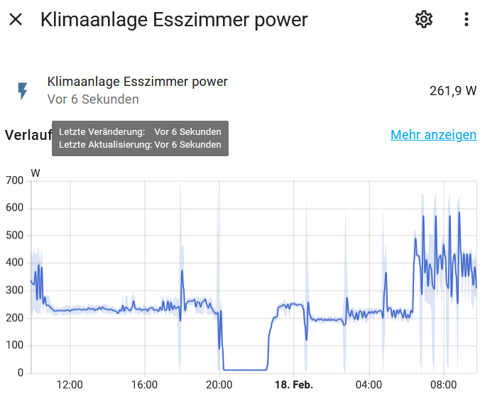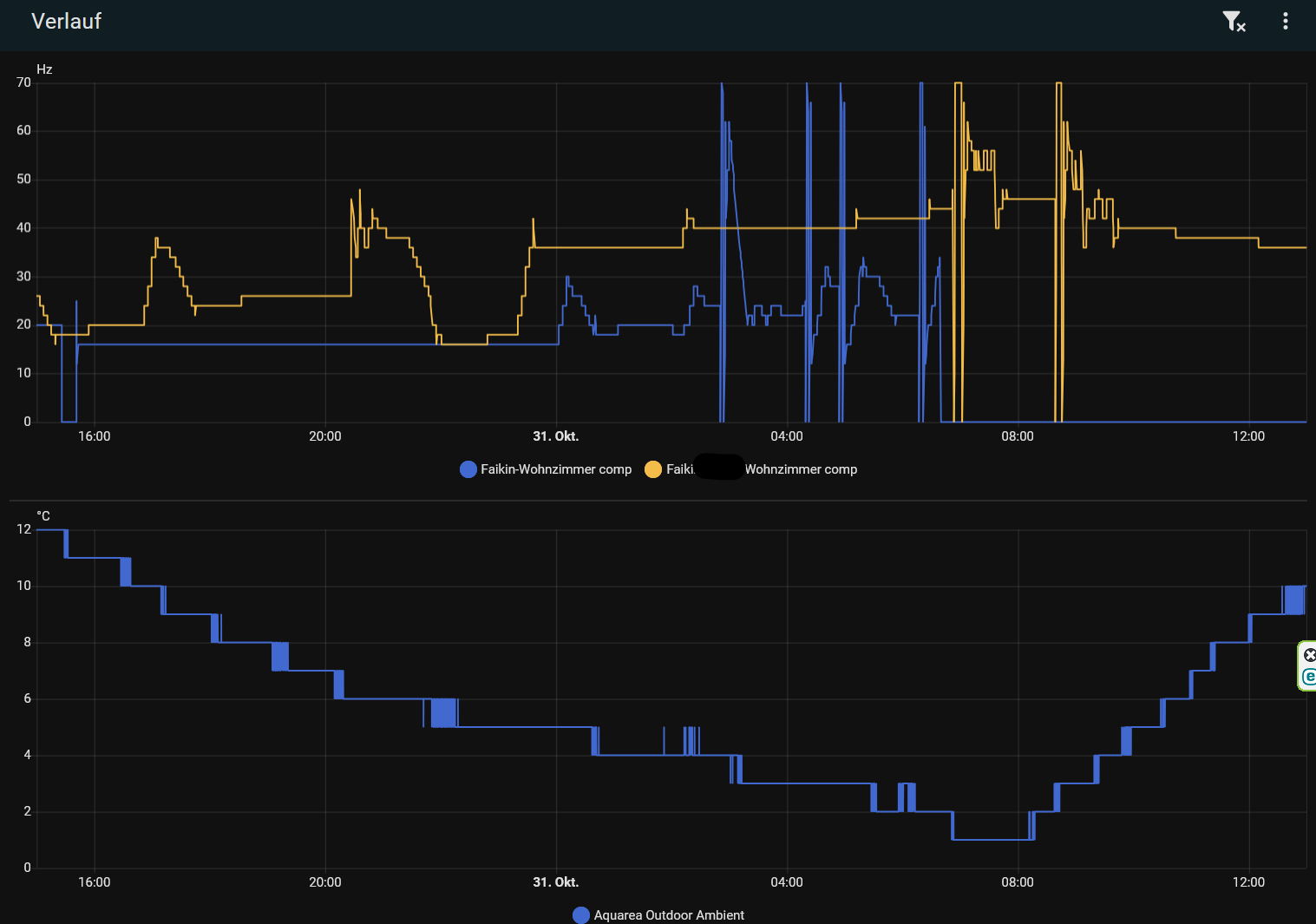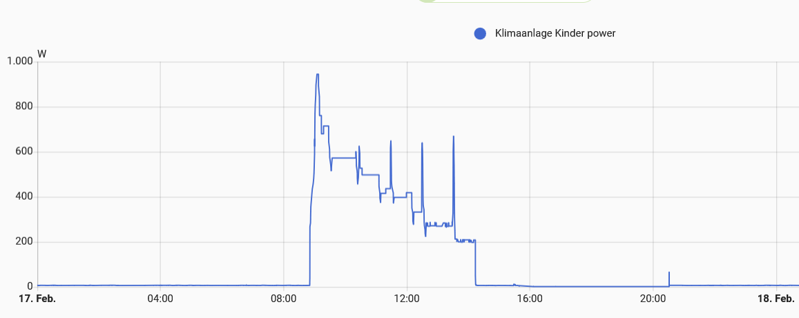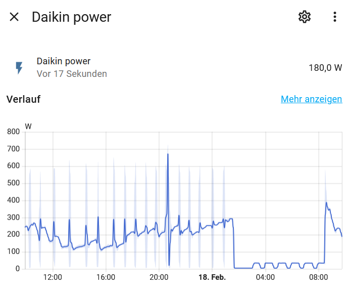 Ich wollte mal testen, ob es sinnvoller ist, meine Daikin über Nacht mit reduzierter Solltempertur durchlaufen zu lassen. Als ich morgens aufwachte, sah ich auf einmal das Gezacke bei der Kompressorfrequenz, respektive auch beim Verbrauch.
