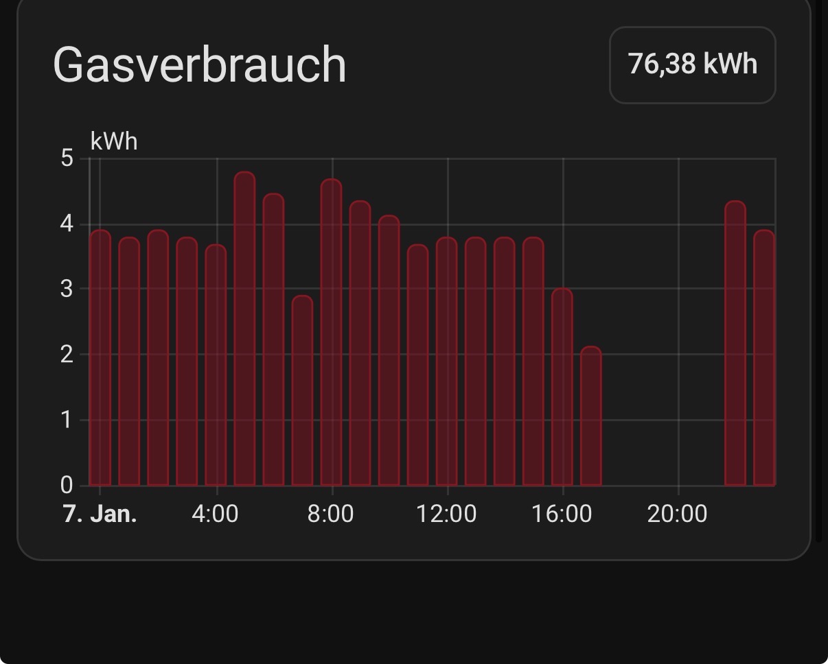 Im Ergebnis ist in den 8h Gas für 64kWh durch die Therme verbrannt worden. Hochgerechnet auf 24h wären das 192kWh und da war während der Laufzeit noch nicht mal die eisige Nacht dabei.