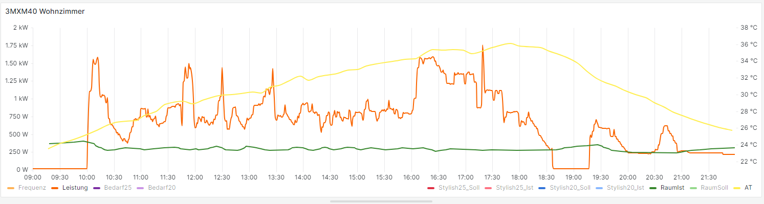 Ich steuere weiterhin die Leistungsaufnahme komplett über die Bedarfssteuerung, immer zwischen 40 und 95 % und belasse die Zieltemperatur innen konstant auf 18 Grad. Die Leistungsaufnahme ist dann etwas Außentemperaturabhängig, aber bei >30 Grad AT schwankt die Leistungsaufnahme des Triple Split Geräts zwischen 300/400W (40% Bedarfssteuerung und 1 bzw 3 IG aktiv) und 750/950W (95% Bedarfssteuerung). Meine single Split läuft bei 150-450W bei 40-95% Bedarfssteuerung. Die Bedarfssteuerung Stelle ich 1-2x pro Tag manuell um, je nach verfügbarer solarer Überschussleistung. Unser Ziel ist, nicht mit Netzstrom zu kühlen, daher meistens "nur" zwischen 9 und 19 Uhr (abends gibt der Akku auch immer ein bisschen was dazu).