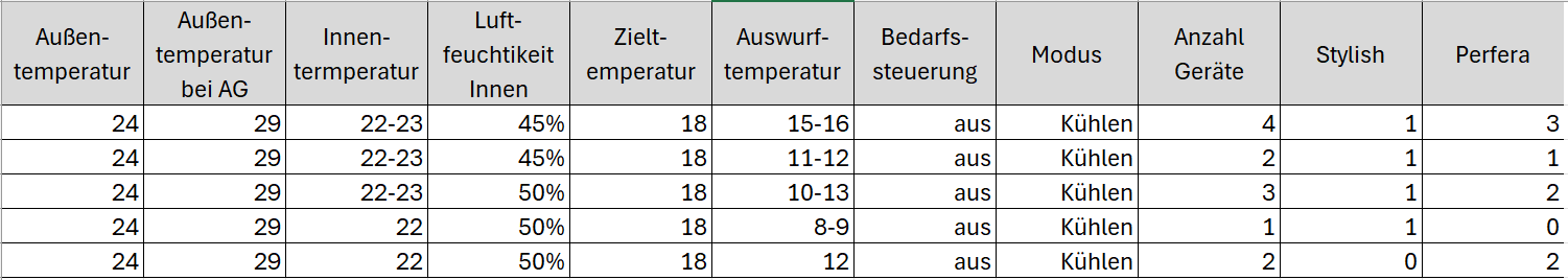 Was denkt ihr dazu? Ich finde die 15-15 Grad Auswurftemperatur bei einer Zieltemperatur von 18 Grad mit vier aktiven Geräten etwas schwach, um ehrlich zu sein. Nennleistung des AG ist 6,8 kW, die Summe der Nennleistung der IGs 8 kW.