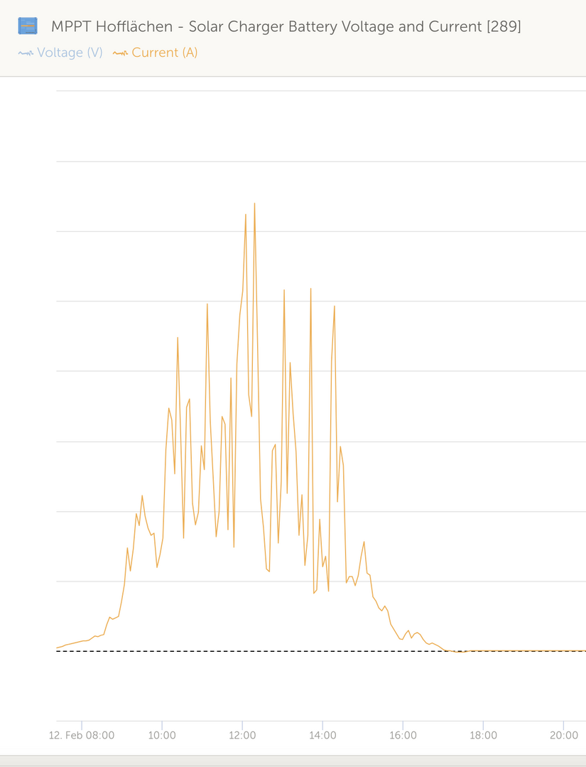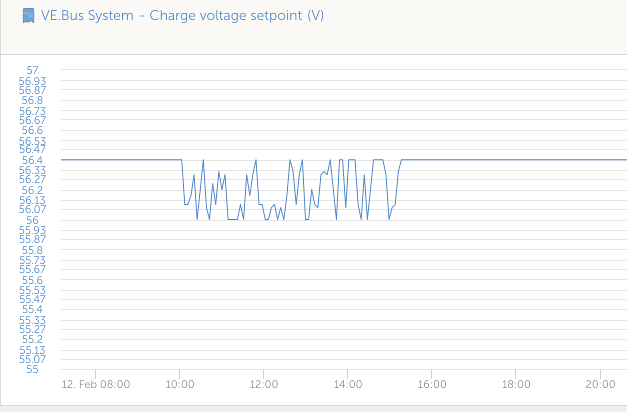 Mir ist aber aufgefallen, dass der Ve.Bus Charge Voltage Setpoint ( CVS) permanent zwischen 56.4V und 56V hin und herschwankt. Sollte der nicht dauerhaft um 0,4V angehoben sein, damit die MPPT einspeisen können? Oder habe ich da wieder etwas nicht verstanden Bzw aus welchem Grund/aufgrund welcher Einstellung schwankt der CVS hin- und her?