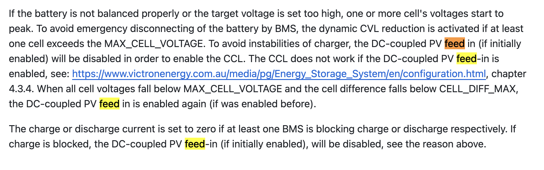 "If the battery is not balanced properly or the target voltage is set too high, one or more cell's voltages start to peak. To avoid emergency disconnecting of the battery by BMS, the dynamic CVL reduction is activated if at least one cell exceeds the MAX_CELL_VOLTAGE. To avoid instabilities of charger, the DC-coupled PV feed in (if initially enabled) will be disabled in order to enable the CCL. The CCL does not work if the DC-coupled PV feed-in is enabled, see:https://www.victronenergy.com.au/media/pg/Energy_Storage_System/en/configuration.html, chapter 4.3.4. When all cell voltages fall below MAX_CELL_VOLTAGE and the cell difference falls below CELL_DIFF_MAX, the DC-coupled PV feed in is enabled again (if was enabled before).