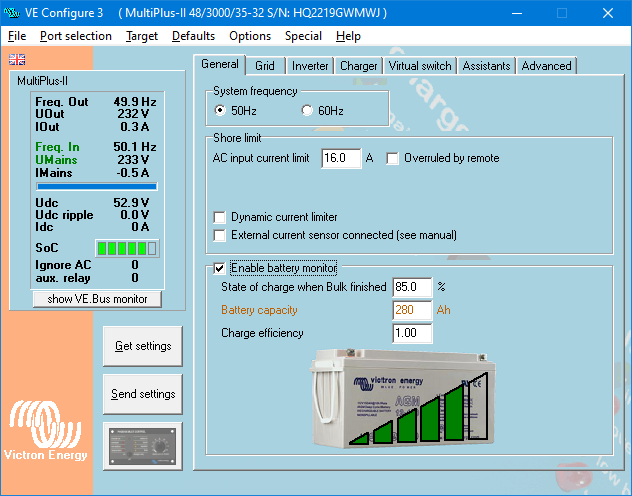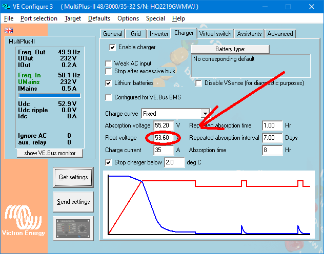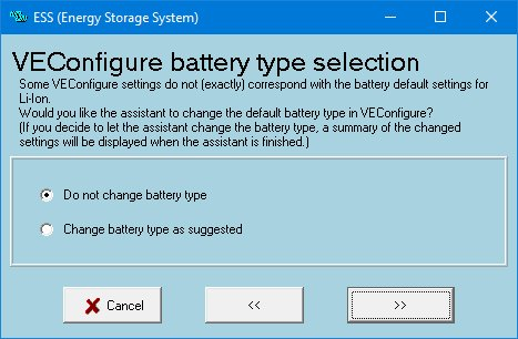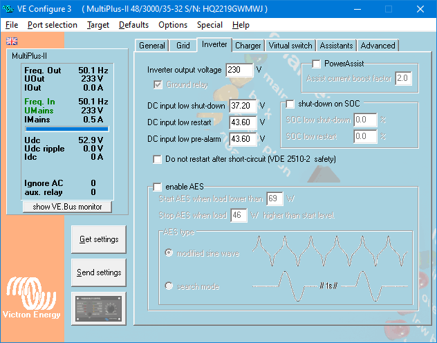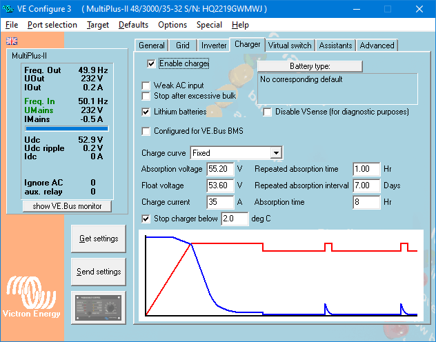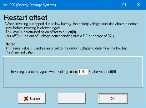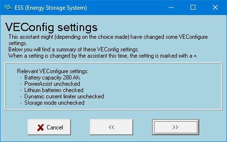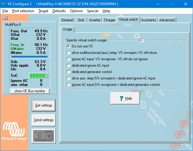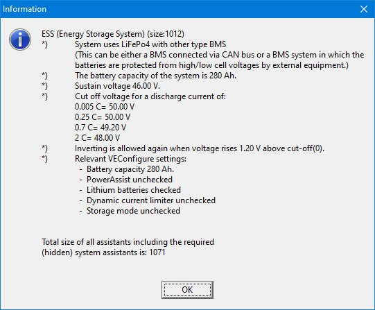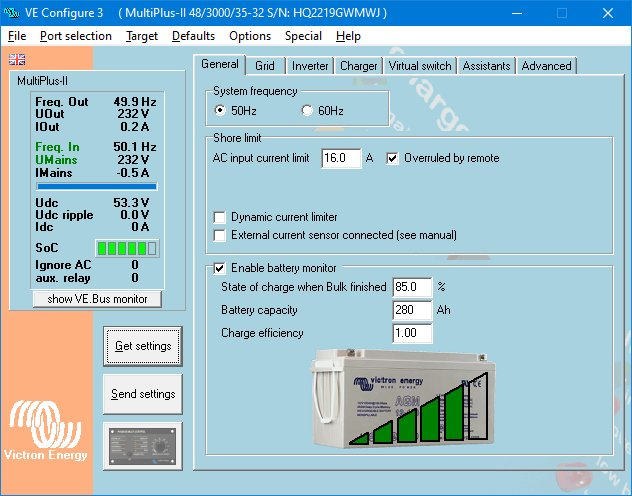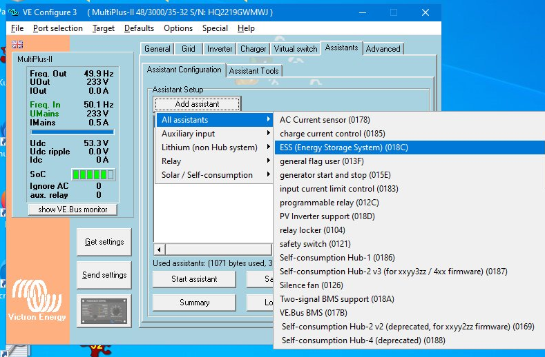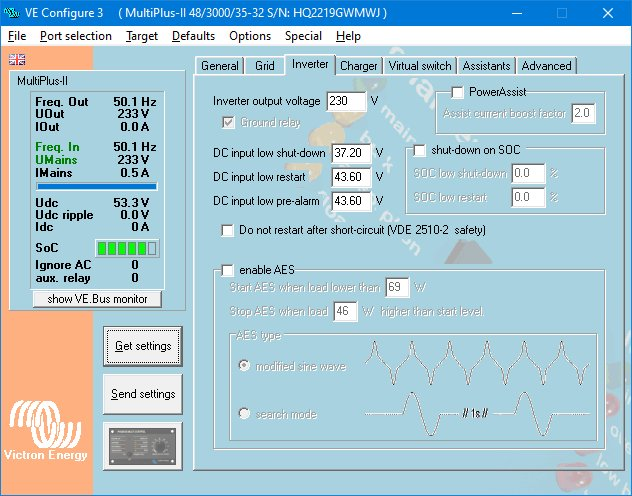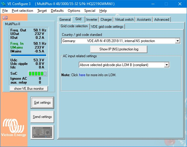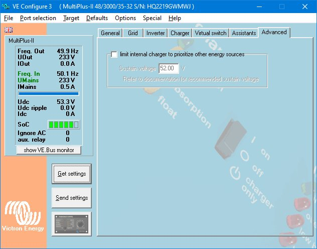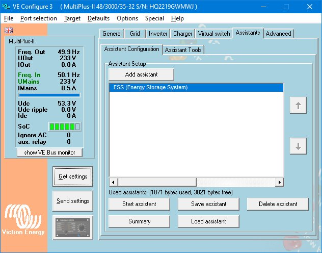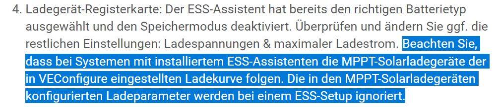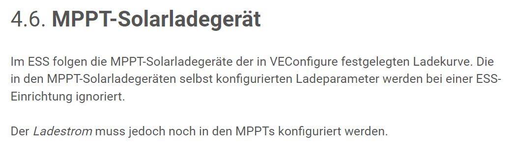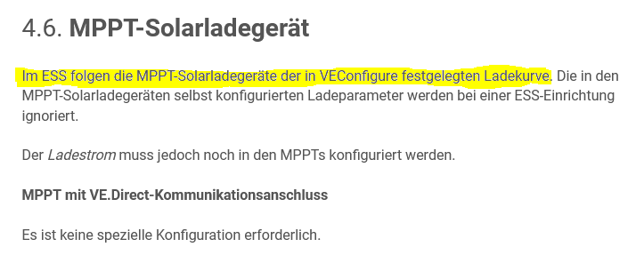 Ja Victron kann einem schon den ein oder anderen Nerv kosten, aber wenn es läuft dann läuft es . Ohne zu wissen in wie weit ESS die Einstellungen beeinflusst wie zb. die Sache mit den Spannungen für die MPPT, würde ich dir als erstes raten sämtliche Einstellungen im MP über VictronConnect zu machen. Da ist alles viel übersichtlicher und somit auch verständlicher (MK3 zu USB Interface). VE.Configure ist veraltet und wurde laut Victron durch VictronConnect ersetzt. Das einzigste was bisher über VictronConnect immer noch nicht geht sind zb. die Assistenten zu installieren und der Grid Code... der Rest ist 1zu1 auch über VictronConnect zu finden, einstellbar, und das weitaus komfortabler . Ich kann dir zum ESS nicht wirklich viel sagen da ich wie gesagt selbst kein ESS in Betrieb habe aber die restlichen Einstellungen kenne ich alle und weiß auch wie man sie einstellen muss bei einem Insel System mit Netzunterstützung (Akku leer). Und verlasse dich nicht auf die Meldungen die Victron ausgibt, da gibt es einige Irreführende Meldungen die mich auch schon einiges an Zeit gekostet haben . Meldungen wie zb. "Batterie Spannung niedrig" kommen auch wenn die eingestellte SOC Grenze für "Niedrige SOC-Abschaltung" erreicht wird usw.. Und ja das kann einem dann schon in den Wahnsinn treiben, ich habs selbst alles durch .