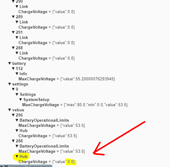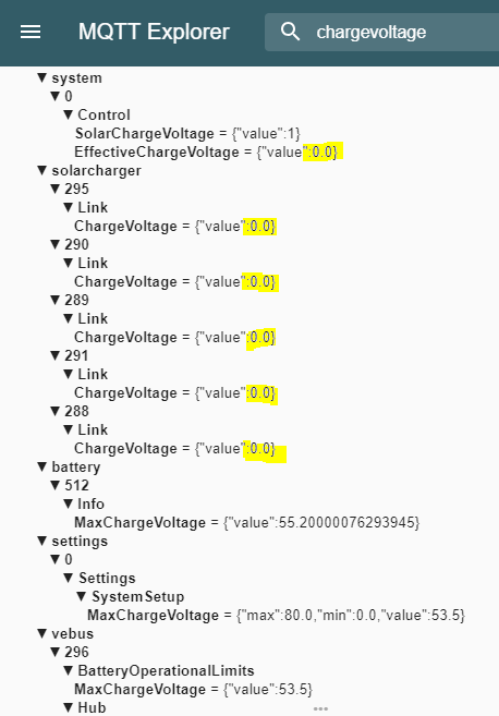 Mit MQTT kenne ich mich leider nicht aus, aber du scheinst ja einiges anders machen zu wollen als es normal ein ESS System macht. Was sind das für Werte, wo kommen die her? Wie ich sehe wohl von den Ladereglern... ist es dann nicht normal das da 0 steht, denn wie gesagt werden die Parameter der Laderegler außer Kraft gesetzt und vom Multiplus vorgegeben. Du müstest also wohl dann eher die Werte vom Multiplus auslesen?