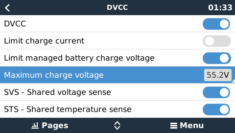 Meine Laderegelung (eines meiner Skripte ) tut nix anderes als abhängig vom SoC Wert die Ladespannung zu begrenzen, wie es auch im DVCC möglich ist. Die Werte (der Wert) tauchen auch genau da auf: