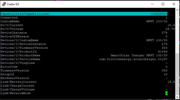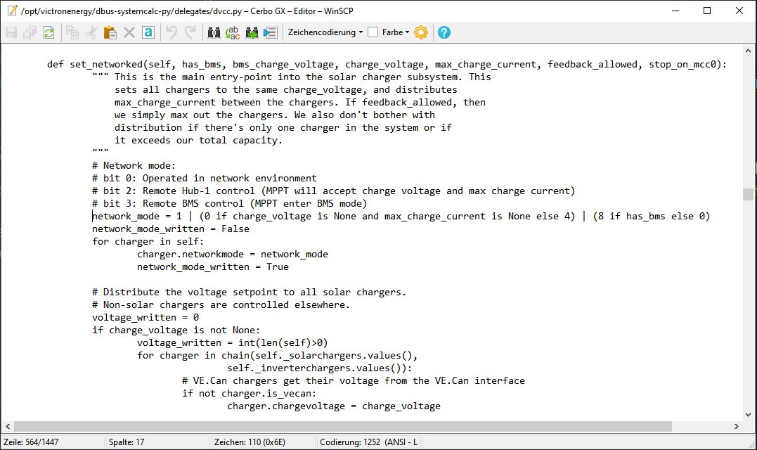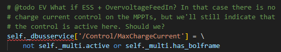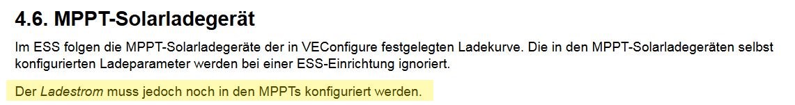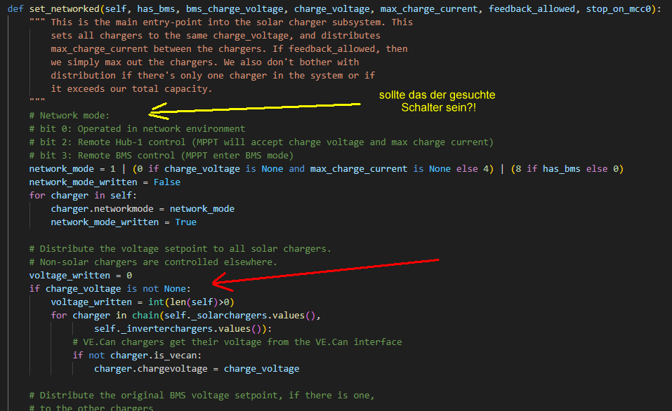 ganz so trivial wie das einfach-nur-dem-Multiplus-den-Mund-Verbieten bei der Ladespannungsvorgabe ist das wohl nich. Ich denke, dass in den MPTT Ladern beim Systemstart etwas konfiguriert wird, was ihnen sagt "nehmt nicht eure Algothythmik sondern tut was euch gesagt wird" (zumindest mäkeln die ja wenn die Verbindung nicht mehr da ist und stellen ihren Dienst dann komplett ein). Das müsste man schon mal finden...