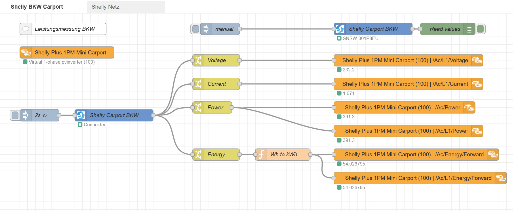 In Node-RED dann die Palette “node-red-contrib-shelly” laden und schon kann man alle Shellys wunderbar auslesen / steuern.