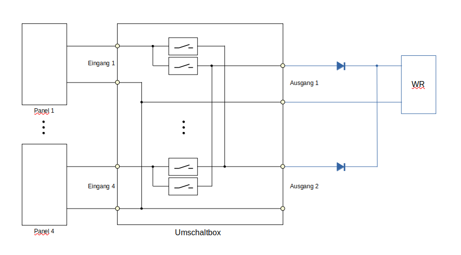 Einen WR wie vorgesehen an die Umschaltbox anschließen und den Speicher über ein Netzteil bei PV-Überschuss laden oder für den Speicher 2 eigene Module installieren.