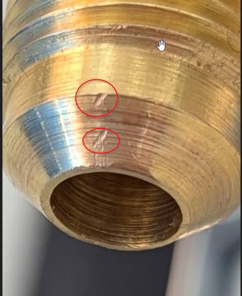 Wenn man nun die Veschraubungen etwas genauer inspiziert, lassen sich noch viel kleinere Lecks sicher erkennen. Bild 4 zeigt eine ganz kleine Undichtheit. Hier entstehen ganz kleine Blasen, die sich wie einer Perlenkette aneinanderreihen. Nehmen wir hier an, es braucht eine Perlenkette von 10 Blasen für einen sicheren Nachweis. Die Blasengröße schätze ich auf kleiner 1mm, aber rechnen wir ruhig mal großzügig mit einem Volumen pro Blase von 1 mm³. Das wären in 15 min dann 10 mm³ und im Jahr 350400 mm³ = 0,35 l. Und damit sind wir bei einer Nachweisgrenze von gerade mal 1g Kältemittel pro Jahr.