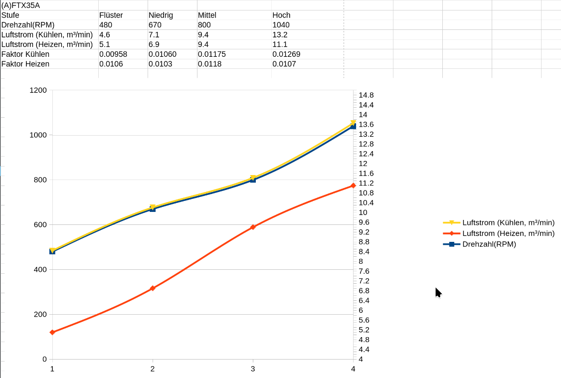 Bin gerade dran den tollen Script von @brezel zur einfachen COP Berechnung um die R290 und weitere Anlagen zu ergänzen. Dabei ist mir aufgefallen das in den Datenblätter der Hersteller (z.b Daikin, Midea) fast immer der Volumenstrom in m3/h angegeben wird und wir (ich) dem rechnerisch die RPM zuordnen. Kommt vermutlich daher das wenige Hersteller nur den Höchst Volumenstrom und die Lüfterdrehzahlen Melden.