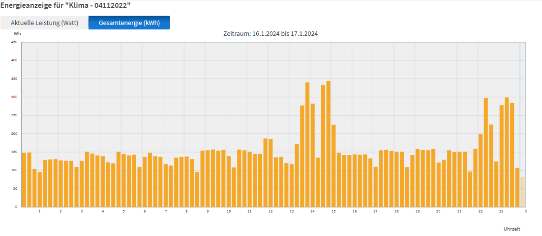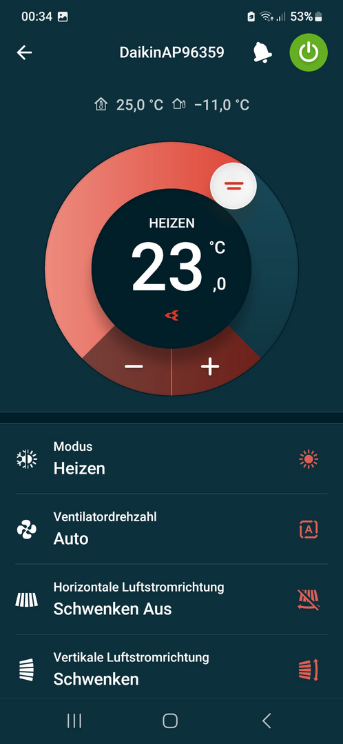 Heute lief die Anlage schon vor Feierabend mit Solarstrom, die Bude war also fett vorgewärmt. Als ich dann im Raum war, lief die Anlage zwischen ~300-550W. Die Schwankungen kommen vor Allem durch die Abtaupausen, nach dem Abtauen fährt die Anlage wieder auf höhere Leistung. Ich habe die Anlage bisher immer sofort abgeschaltet, wenn sie mit dem Abtauen begonnen hat. Das muss aber schnell gehen, weil der Abtauvorgang sonst auch durch Abschalten nicht mehr unterbrochen wird. D.h. möglichst sofort nachdem das Innengerät aus geht (Lüfter stoppt mitten im Lauf) abschalten. Nach ca. 1Min per Fernbedienung wieder anschalten.