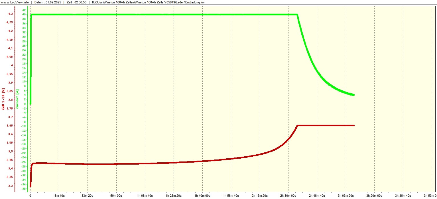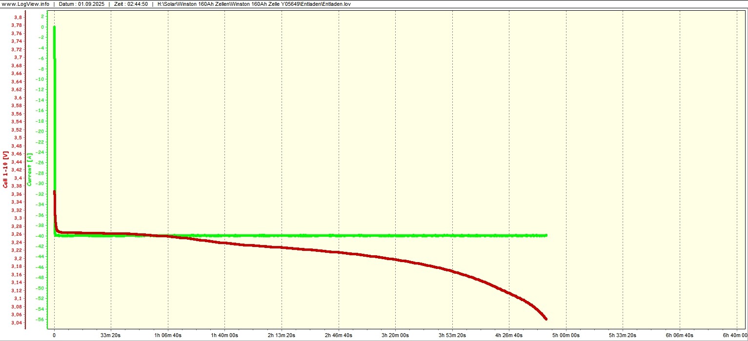 So ganz sauber sind die Kurven nicht, sicher ne Kontaktsache. Ich würde ja sagen ignorier die Zacken, ich frage mich allerdings wie hoch die Ruhespannung beim ersten laden war weil die Spannung erst auf etwa 3,4V aufsteigt und dann aber unter 3,35V abfällt...