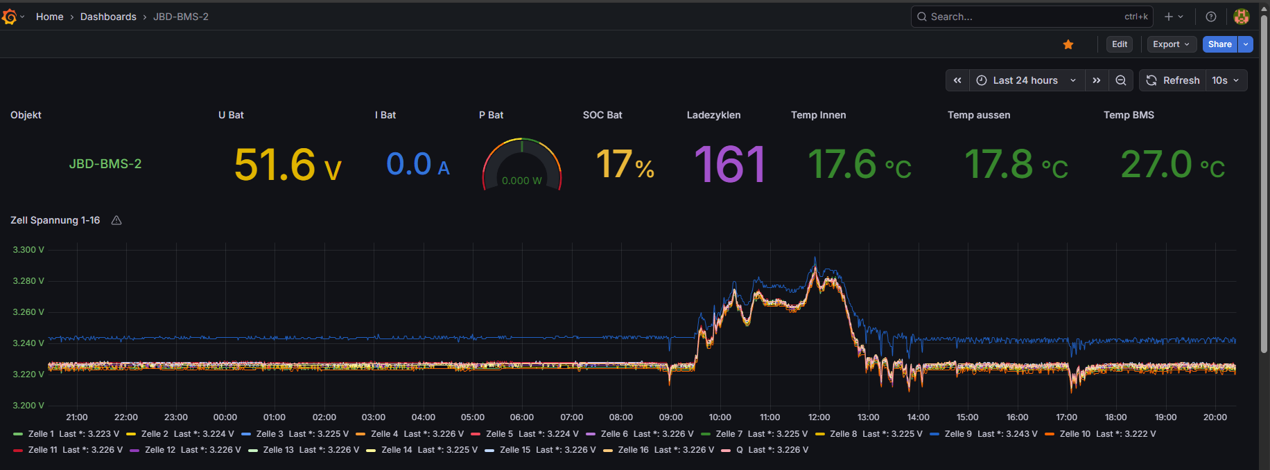 Mein JBDBMS2 ist so der Frankenstein Akku ist ein 16s mit 300ah Zellen + eine zusätzliche Zelle an Batterie NR 9 weil mir diese immer abhaut, obwohl sie die selbe Kapazität wie alle anderen hat auch der Innenwiederstand passt, seit dem diese Zelle eine Zusätzliche Zelle dran hat funktioniert der Akku tatellos, bis auf das das BMS das immer voreilt.