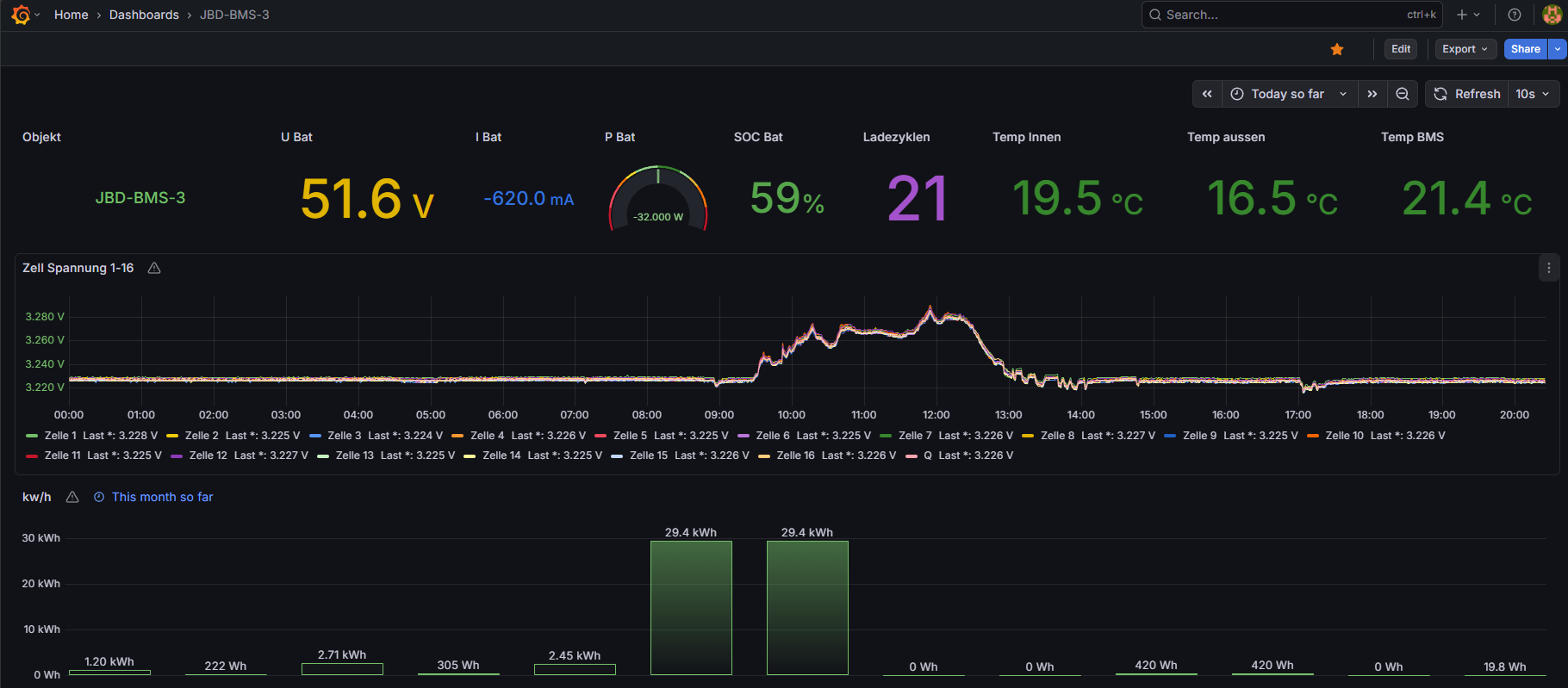 Was macht die JBDBMS so besonders sie haben ein aktives Relais sobald nur eine Zelle ihre Parameter verlässt schaltet das Relais, sobalt die Temperatur aussserhalb des Parmeters ist richtig schaltet das Relais, alle 3 BMS können 300A und so sind diese auch konfiguriert Mindestspannung der Zellen 2,8 V maximal Spannung 3,6V ,Ladespannung für 100%SOC 3,45V pro Zelle, die Balancer sind Activ ab 3,35V pro Zelle das funktioniert wie es soll.