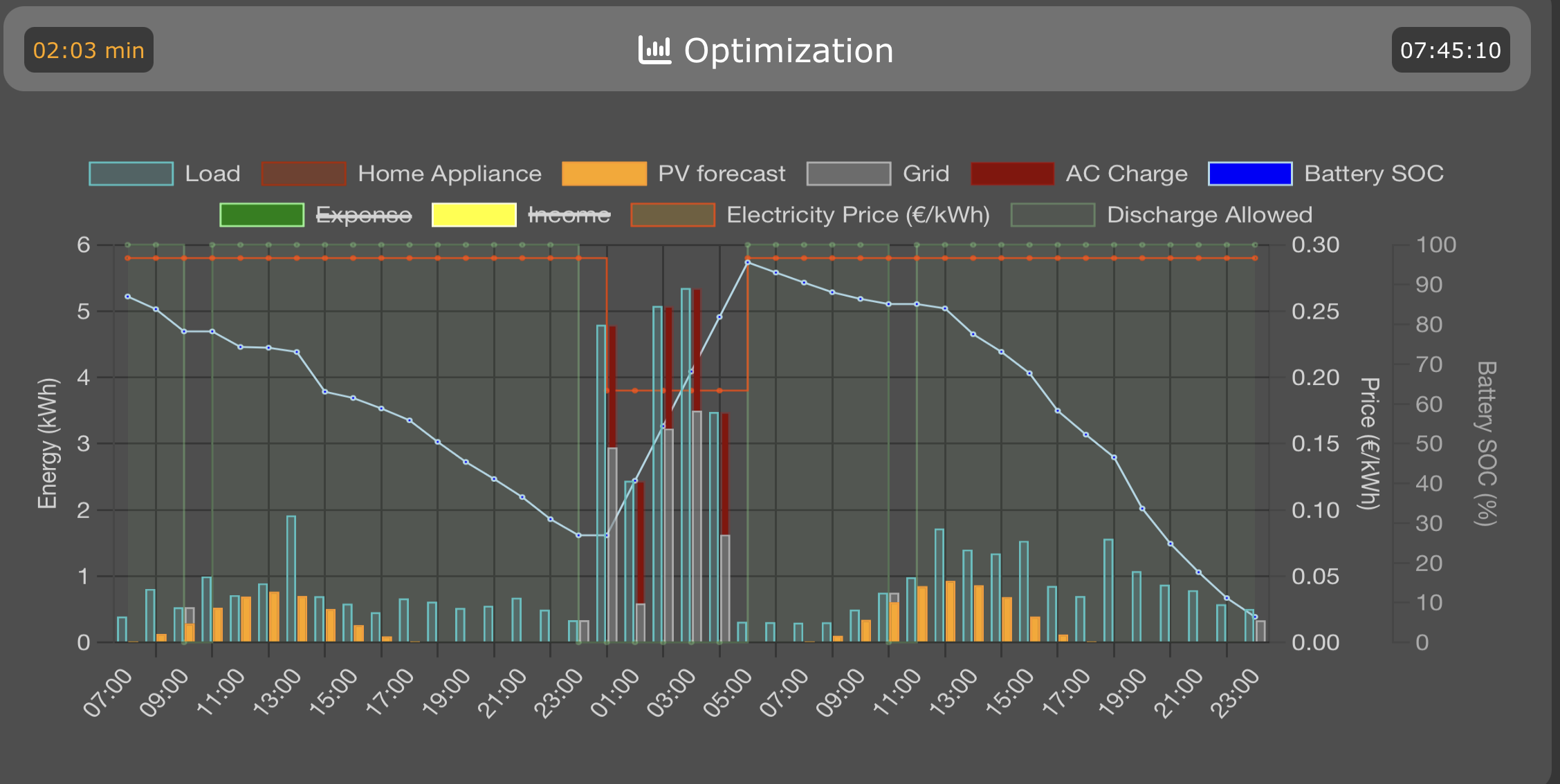 Folgendes Problem: Ich habe einen Stromtarif wo zwischen 0:00 Uhr und 05:00 Uhr der Strom nur 18 Cent kostet. Ich möchte die EOS Optimierung so einstellen, dass dies berücksichtigt wird und, falls nötig, nur zwischen 0 und 5 Uhr der Speicher geladen wird.