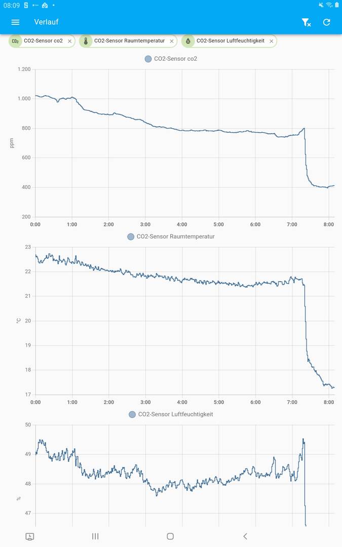Hier ein eine auswertung von gerade eben vom scd41. Ich lüfte morgens, danach werfe ich den specksteinofen an.