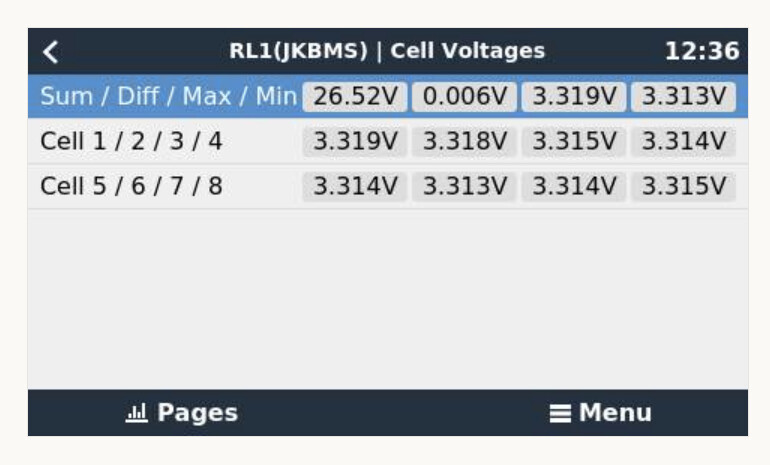Die Inverter BMS übergeben den Wert der niedrigsten und der höchsten Zelle + welches Akkupack betroffen ist. Das reicht i.d.R. auch vollkommen aus und ist sogar noch übersichtlicher. Alternativ kann man auch nen ESP32 nehmen, der sich mittels Bluetooth mit dem BMS verbindet und die Zellspannungen per MQTT ins Victron-System pumpt.