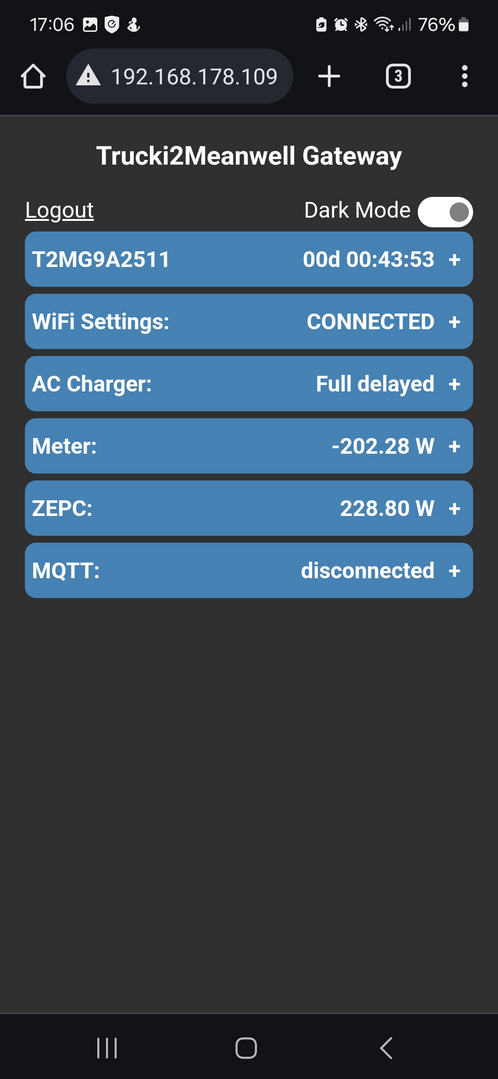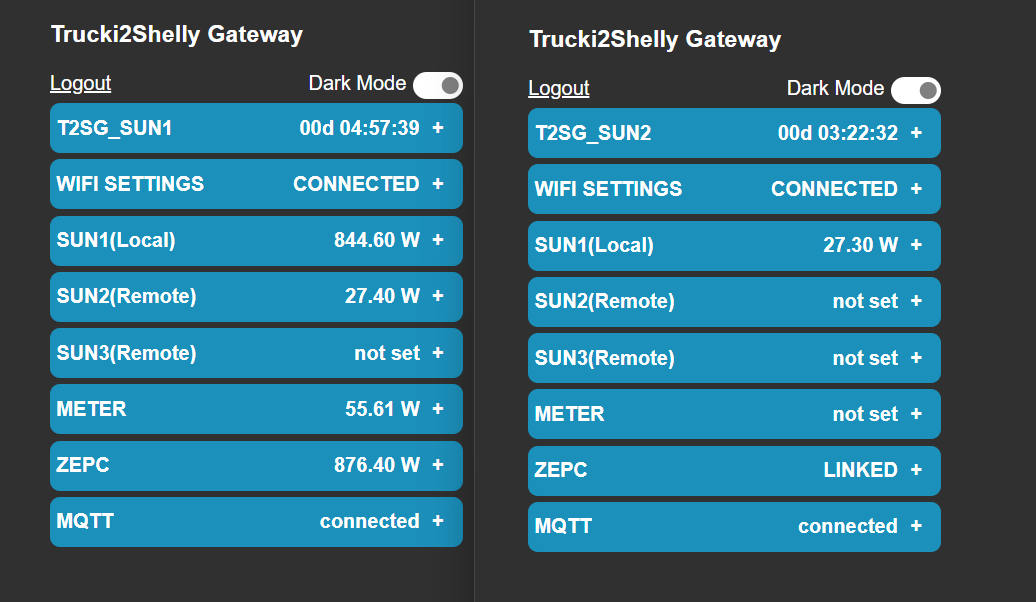 @ubbe kannst Du mal Screenshots von deinem Trucki2Shelly Gateway und nicht Trucki2Meanwell Gateway posten? Die Wifi-Platine im SUN (Trucki2Shelly Gateway) muss auch im Wlan angemeldet werden und die Shelly Einstellungen müssen auch dort hinterlegt werden! Für die erste Inbetriebnahme am besten den int. Limiter Haken im SUN Display erstmal ausschalten! Wichtig den SUN nach jeder Änderung im Display zur Sicherheit neu starten!
