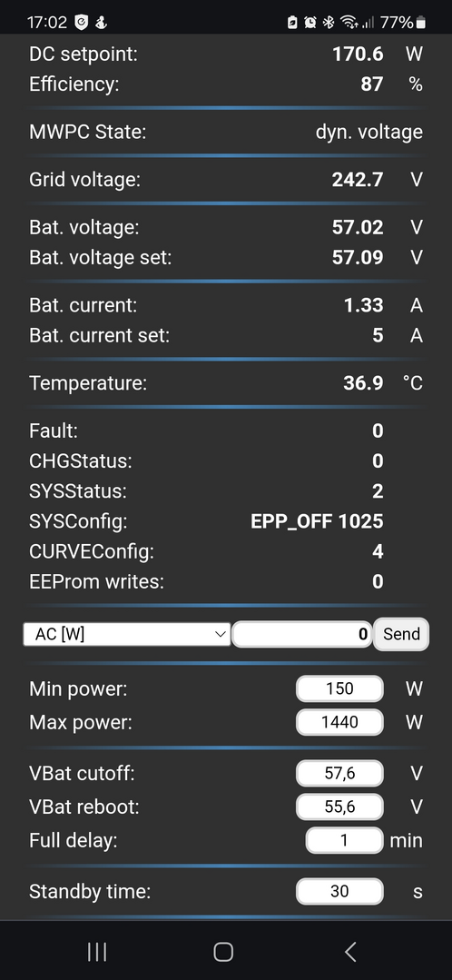 Das T2SG wurde für den Betrieb mit Batterien und nicht Panels entwickelt. Kann gut sein, dass die T2SG Regelung sich hier mit der MPPT Regelung überkreuzt. Eventuell kann der Haken "ZEPC->use display Feedback" helfen. Ich glaube aber nicht.