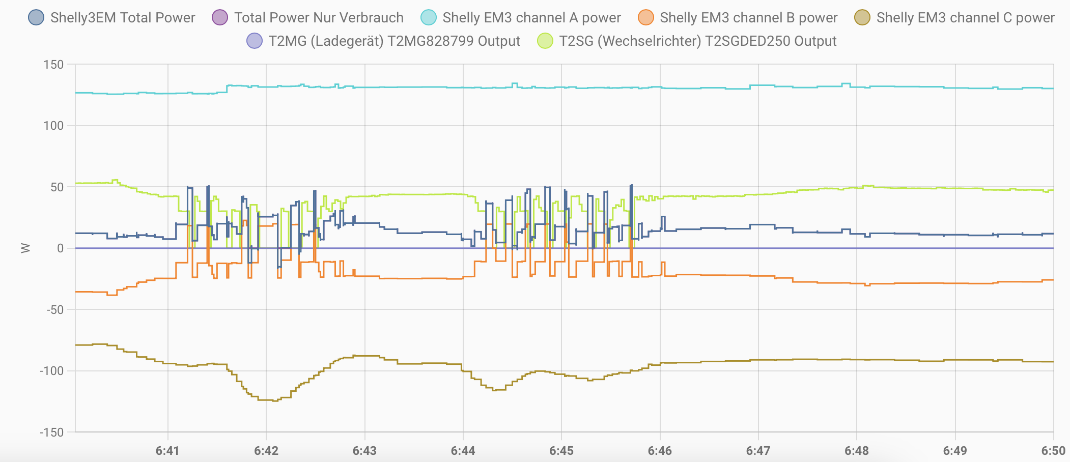 Beispielhaft kann das folgende Bild genommen werden. Er zeigt die die Situation mit aufgehender Sonne (bewölkter morgen) und dem Start der leichten Einspeisung in das Hausnetz (Phase C - braun). Gegen 6:41 Uhr fällt die Leistungsabgabe des WR <40W durch die Einspeisung der PC (-> weniger Energie muss aus der Batterie genommen werden) und es startet die Oszillation von WR (Output - grün). Gegen 6:43 - 6:44 Uhr gibt es eine kurze Stabilisationsphase (WR >40W), wonach das System wieder bis 6:46 oszilliert. Danach läuft es wieder stabil. Andere Situationen bestätigen dieses Bild.