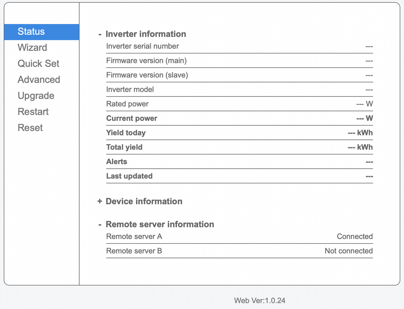 Ich kann noch über das Webinterface auf den WR zugreifen, aber da wird rein gar nichts mehr angezeigt. Auch total Field ist raus. Es ist zwar gefühlt seit Wochen kein Sonnenschein mehr gewesen aber ein paar Watt sollten dennoch herauszuquetschen sein. Laut smart meter wird auch genug null eingespeist und der Grundverbrauch der Bude ist völlig unbeeindruckt.