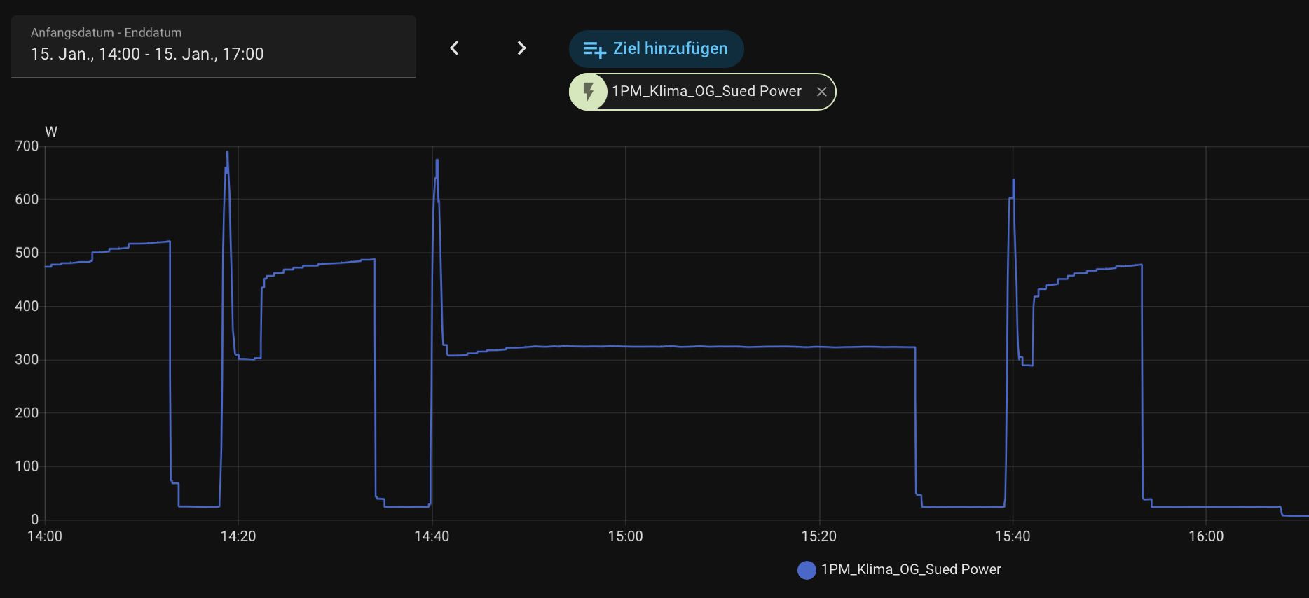 Was mir auffällt: Der Kompresor im Aussengerät ist etwas lauter als unsere anderen (Daikin, Midea) und die Anlage neigt zum Takten. Sie lief jetzt bei unter -10°C meistens auf 500-600W, mit eines Auswurftemperatur zwischen 35-48°C. Statt herunterzuregeln, taktet sie dann. Heute hat es nur rund um 0°C, da sind es ca. 450W mit Takten. Im Herbst ging es runter bis 300W. Beim Kühlen runter bis 180W.